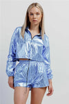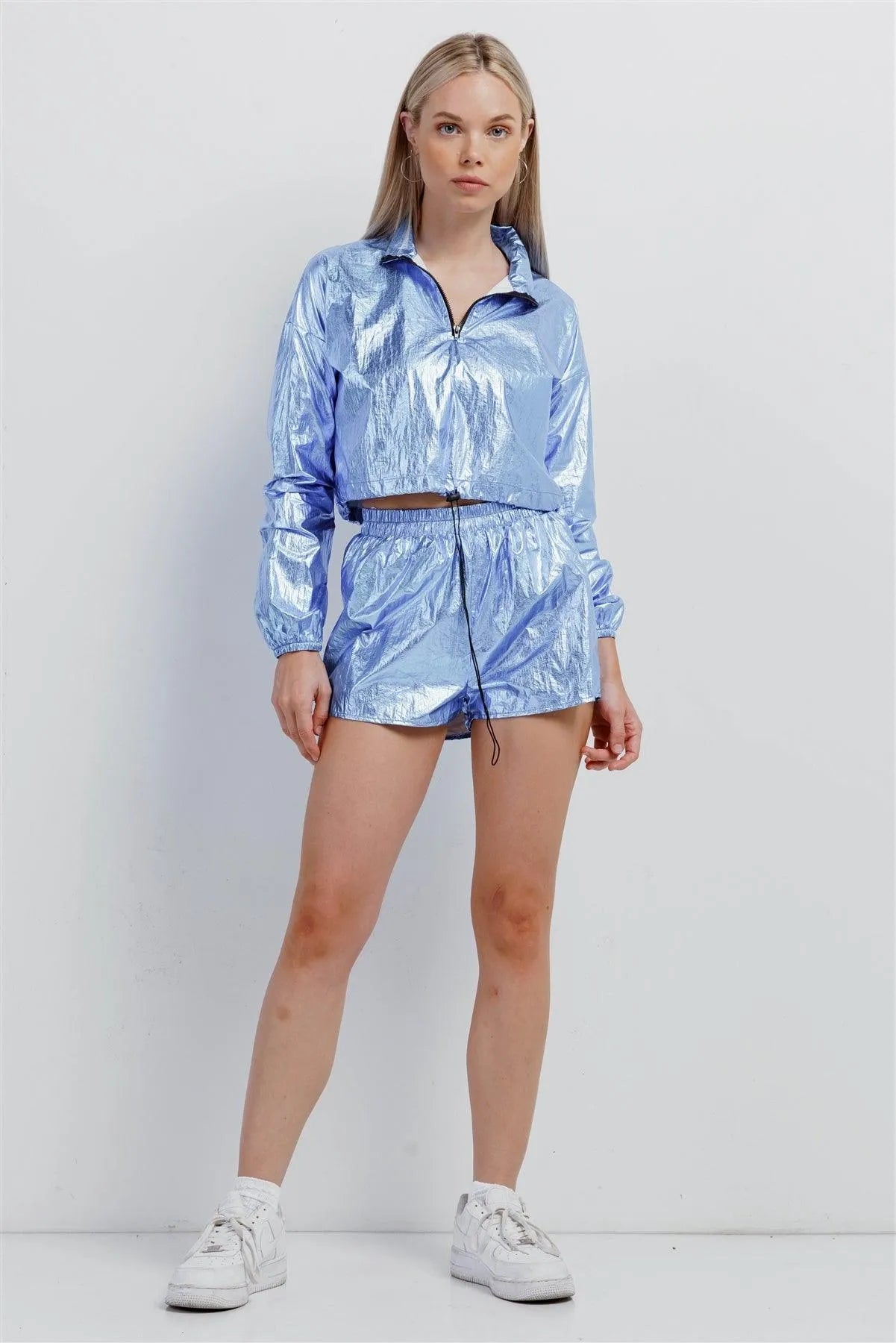 Blue Metallic Lightweight Drawstring Crop Top & Shorts Set /2-2