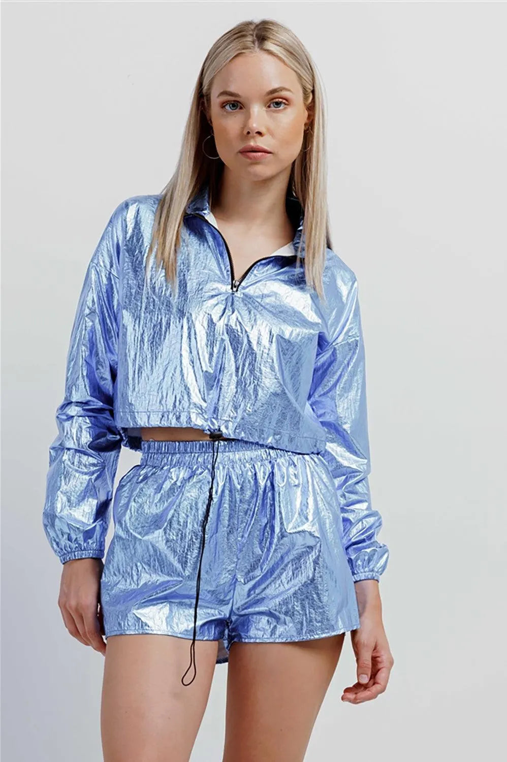 Blue Metallic Lightweight Drawstring Crop Top & Shorts Set /3-2-1