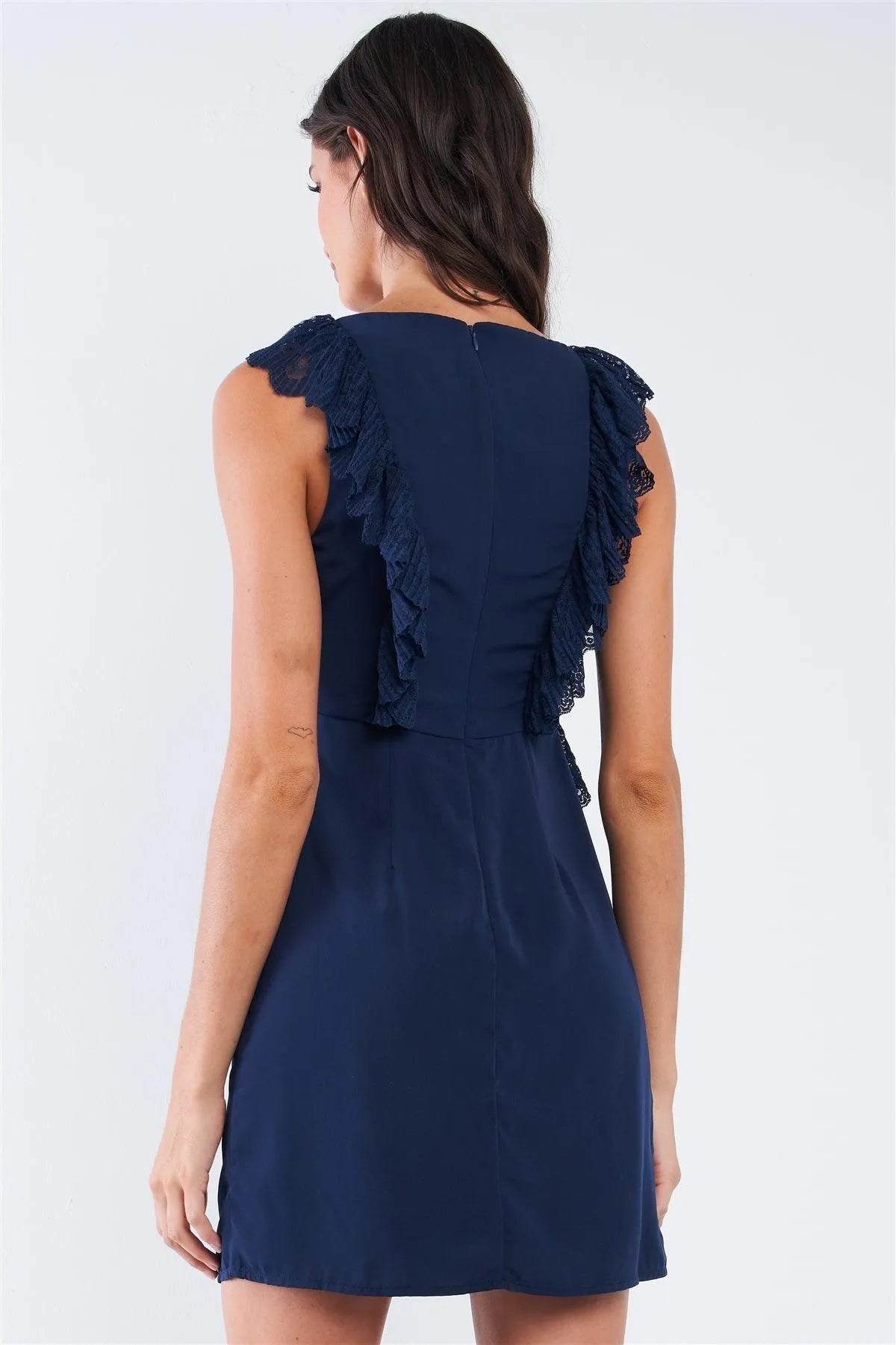 Blue Navy V-Neck Sleeveless Criss Cross Frill Hem Mini Dress /1-2-2-1