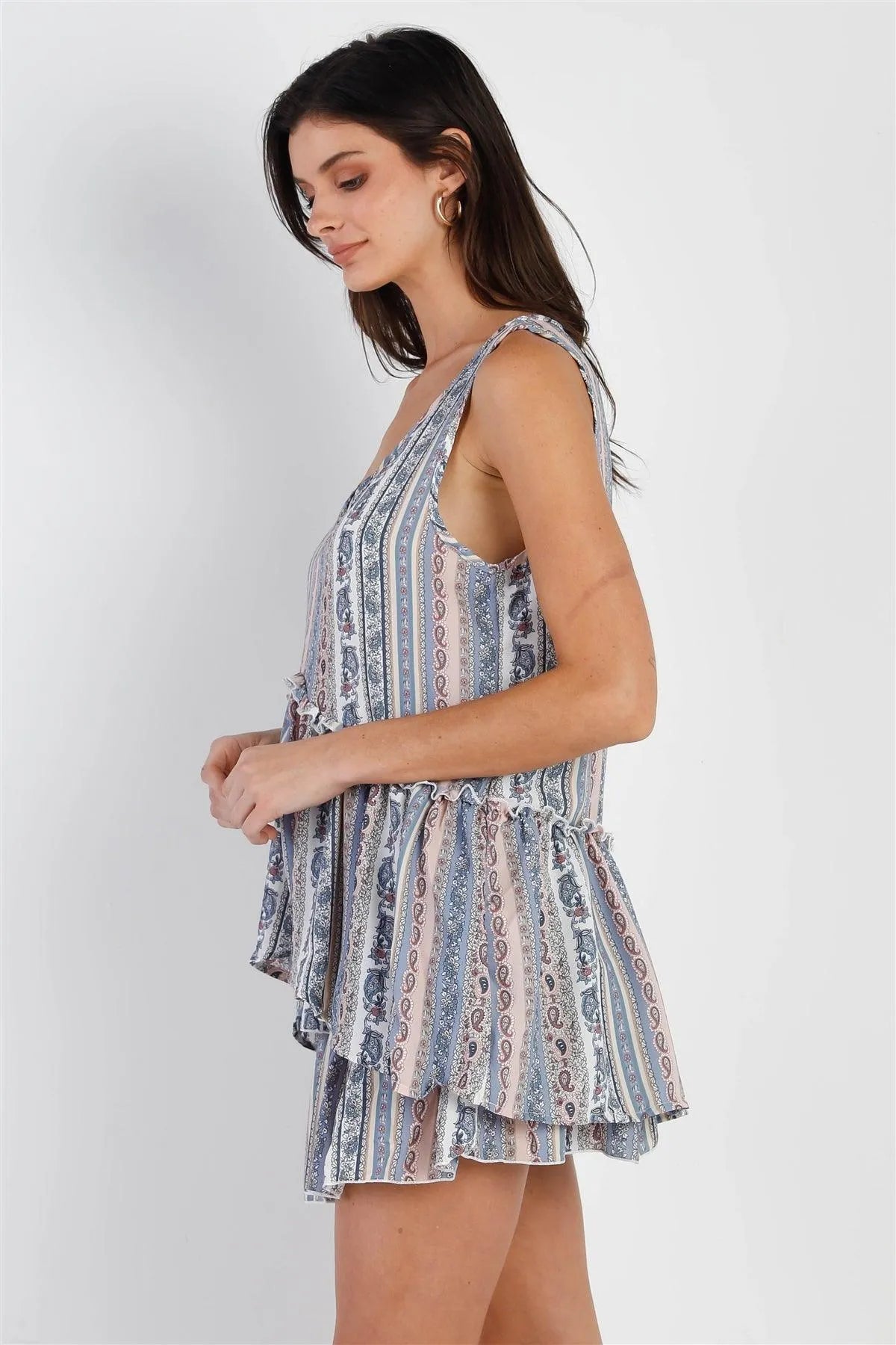 🖤 Item features: Blue pink, paisley print, flare hem, v-neckline, sleeveless, relaxed fit, smocked waistline, super high waist, ruffled, mini length skirt, non-sheer, unlined, non-stretchy, casual, cute, girlish, trendy, stylish, spring/summer collection