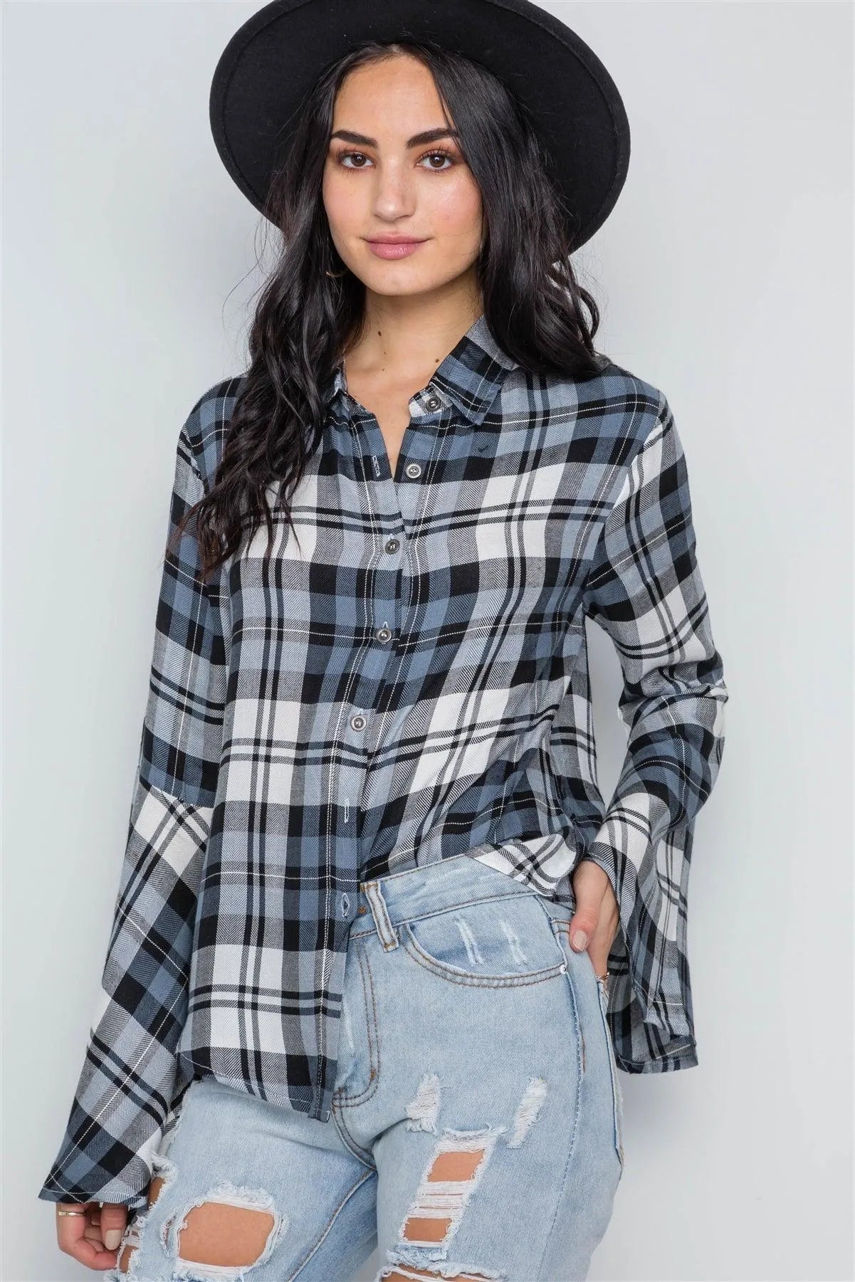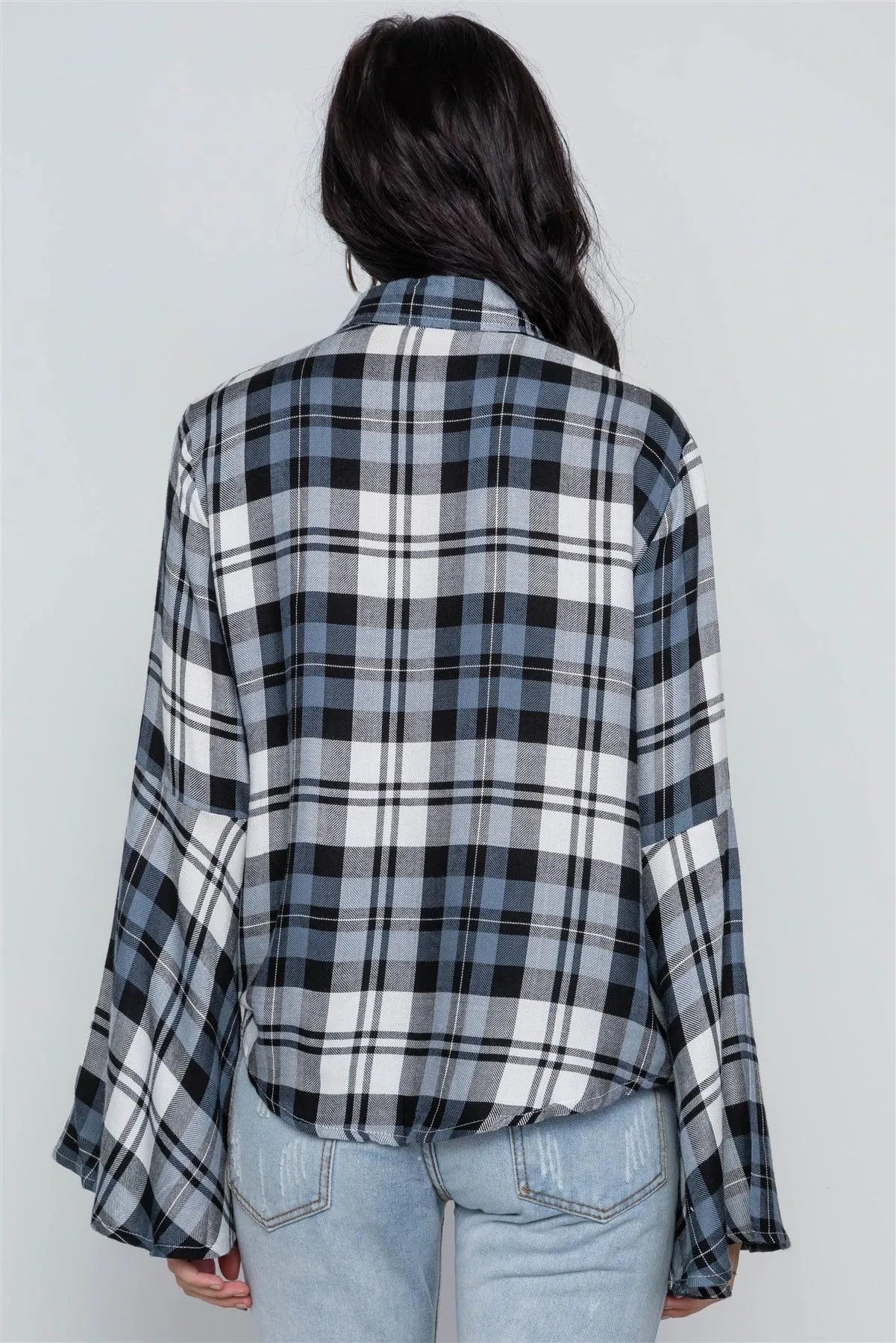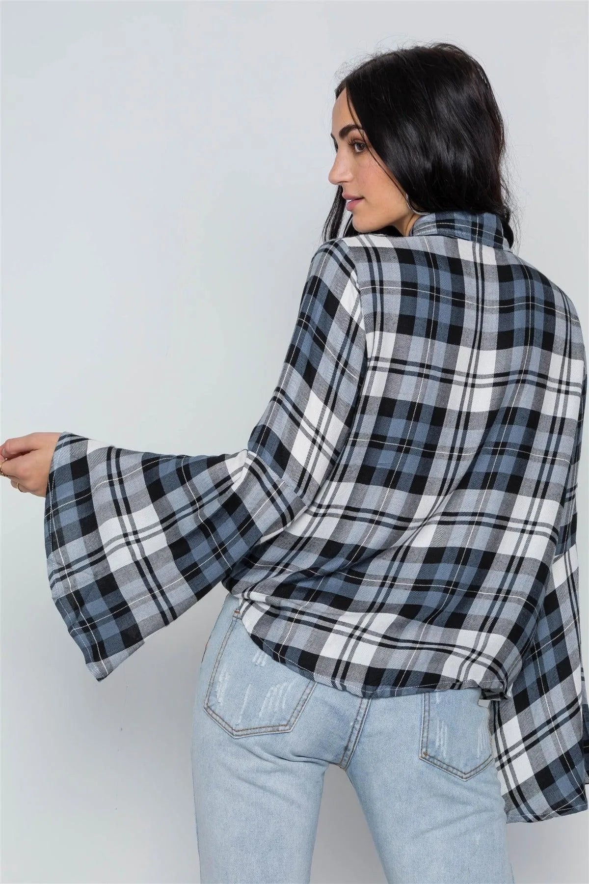 Blue Plaid Button Down Bell Sleeve Top /2-2-2
