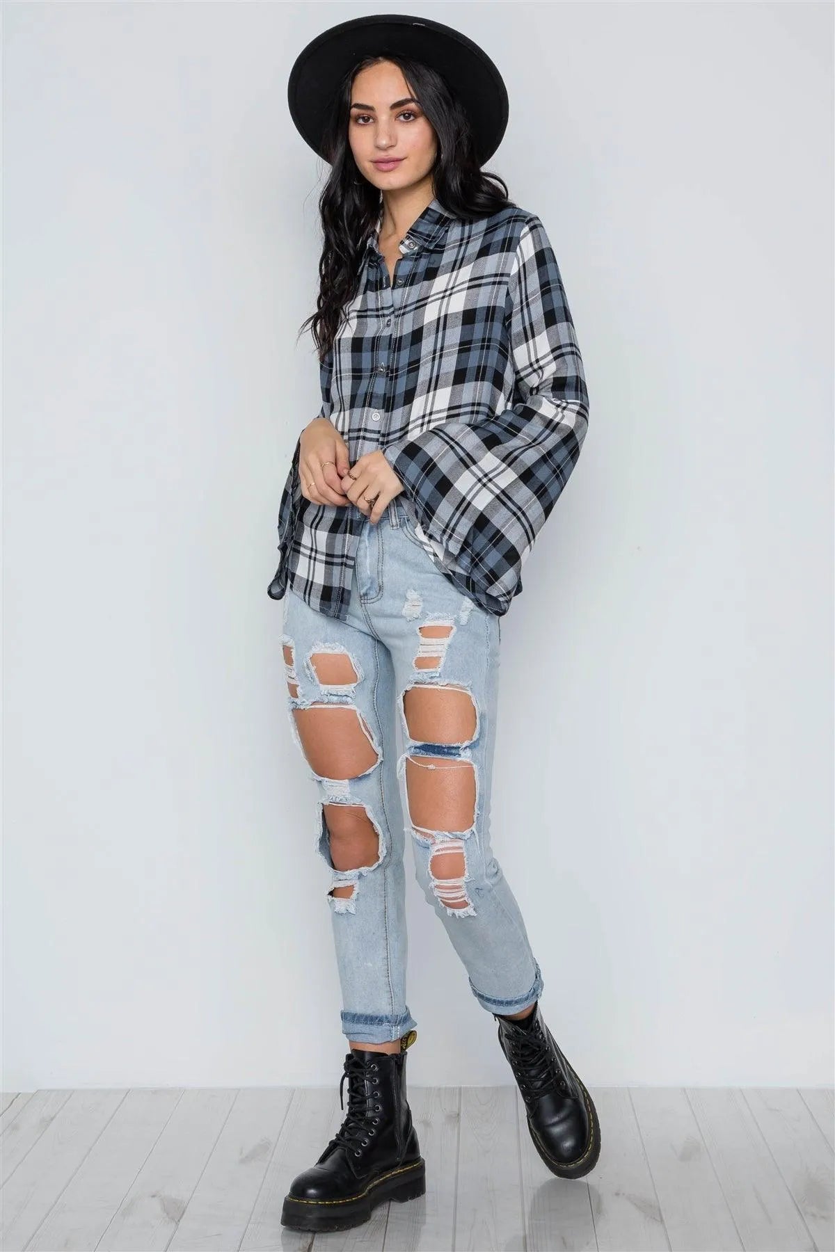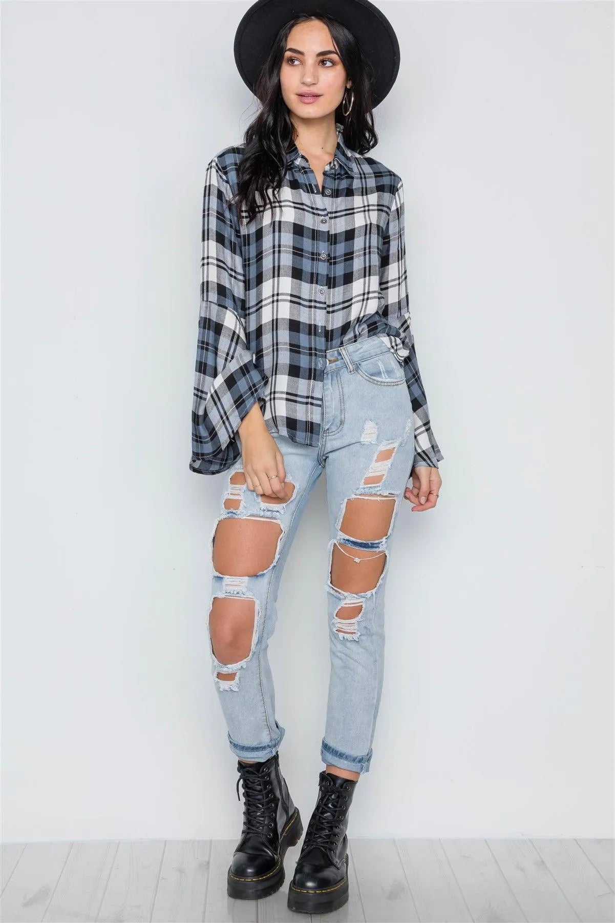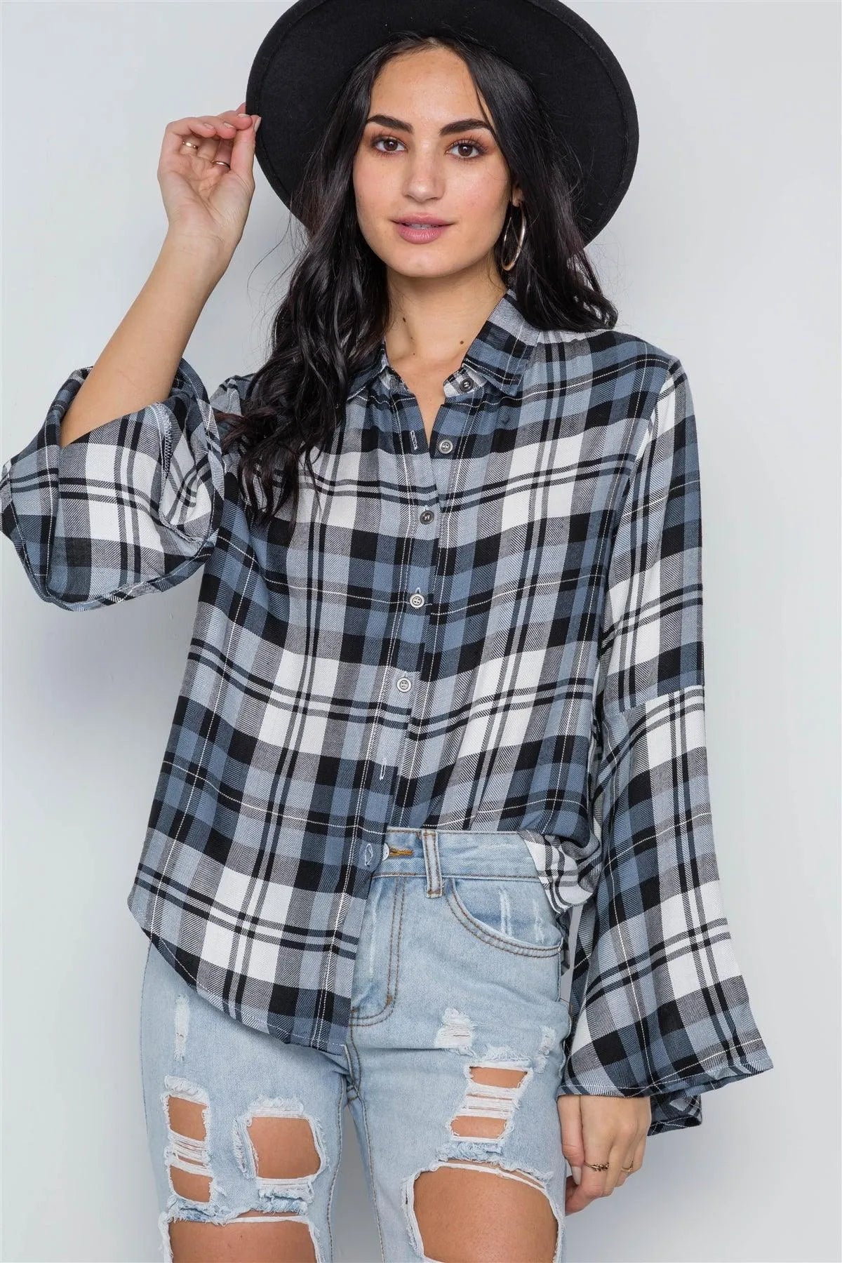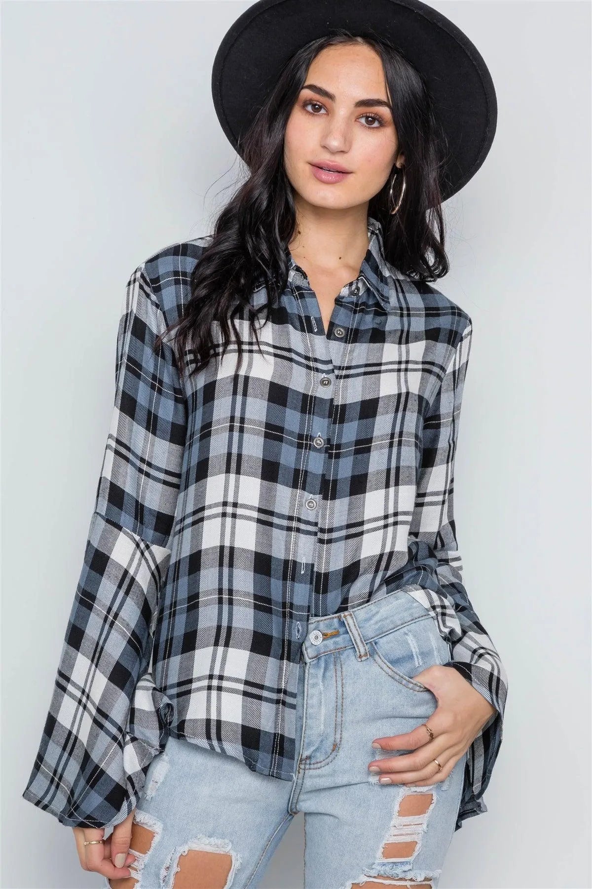 Blue Plaid Button Down Bell Sleeve Top /2-2-2
