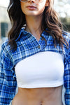 🖤 Item Features: Blue, plaid print, flannel cotton material, shirt type, button up closure, collared, long sleeves, super cropped front, uneven length, unlined, non-stretchy, stylish, trendy, chic, casual, sexy, unique