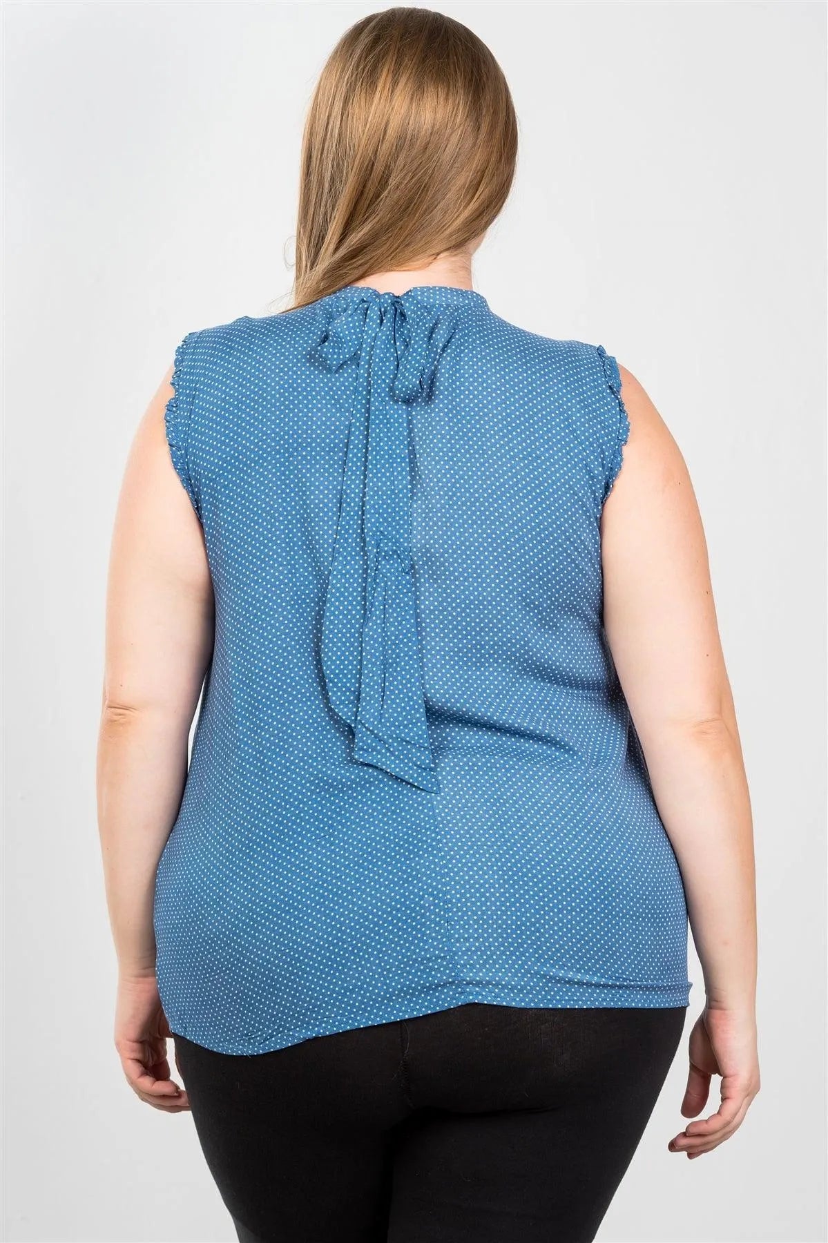 Blue Plus Size Ruffle Polka Dot Bow Back Sleeveless Top /2-2-2