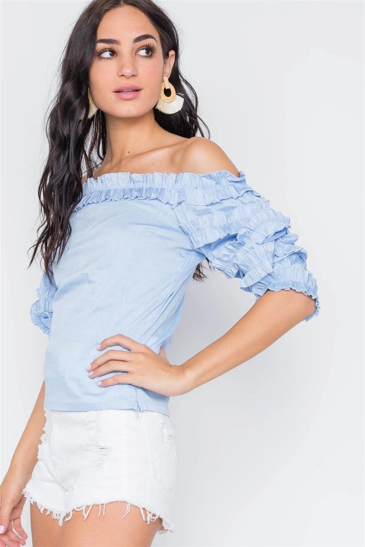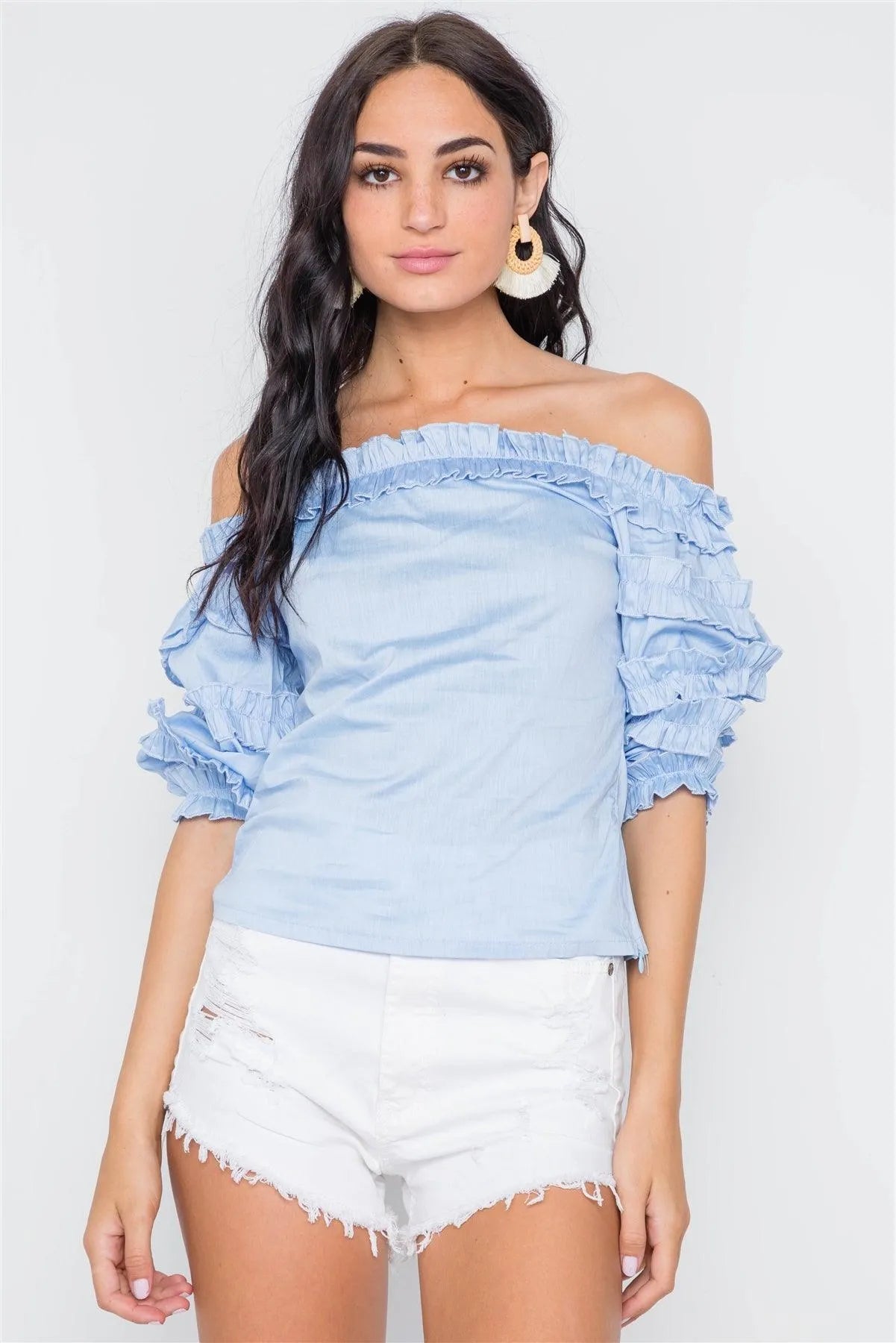 Top features: elasticized shirred off the shoulder neckline, 3/4 puff sleeves with shirred trim detail, hidden site zip closure, unlinedModel is 5'8 and wearing Small (Waist: 24", Bust: 32A, Hips: 34")Item Measurements: Length: 16", Bust: 30" Sleeves: 15"True to sizeAvailable in Yellow