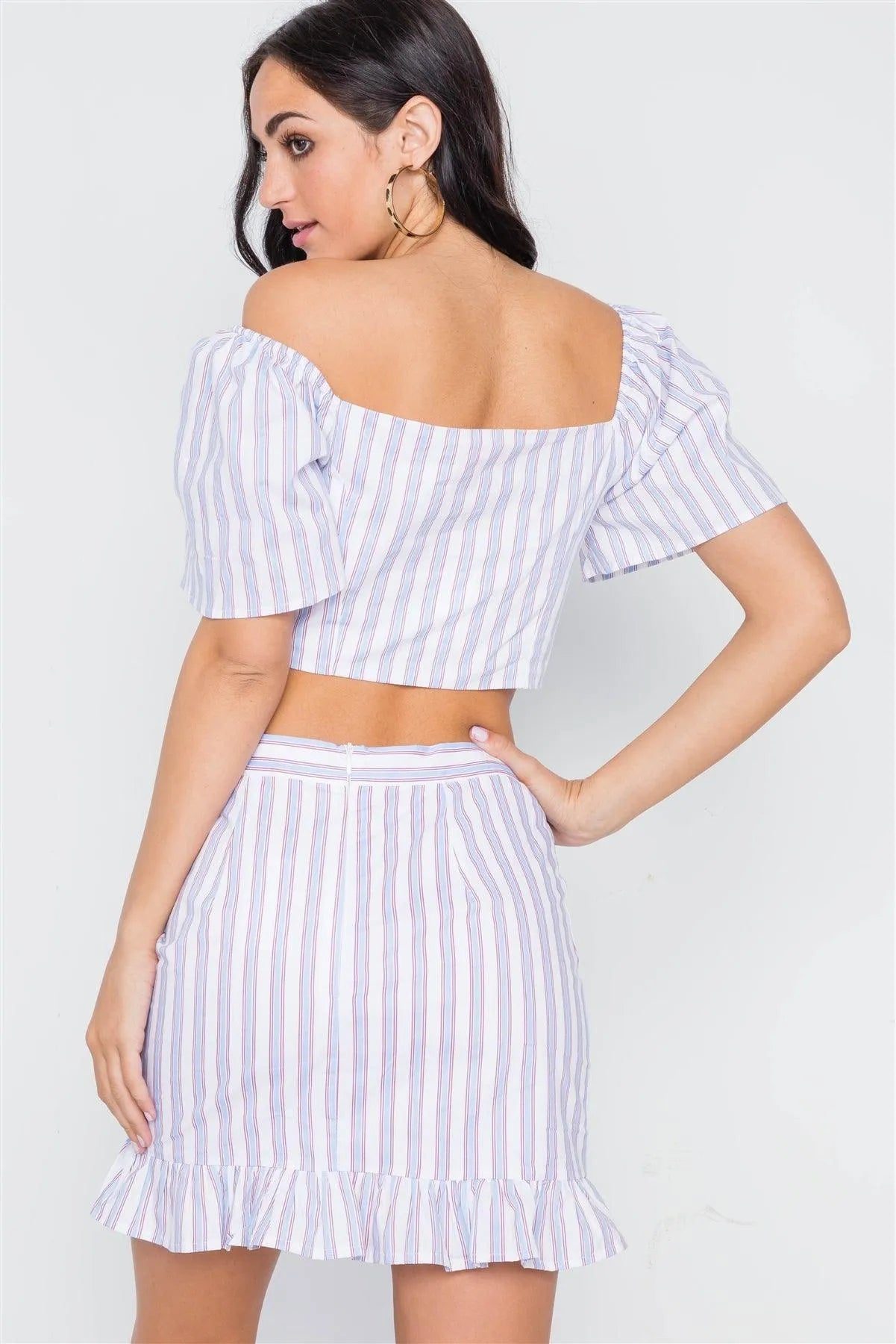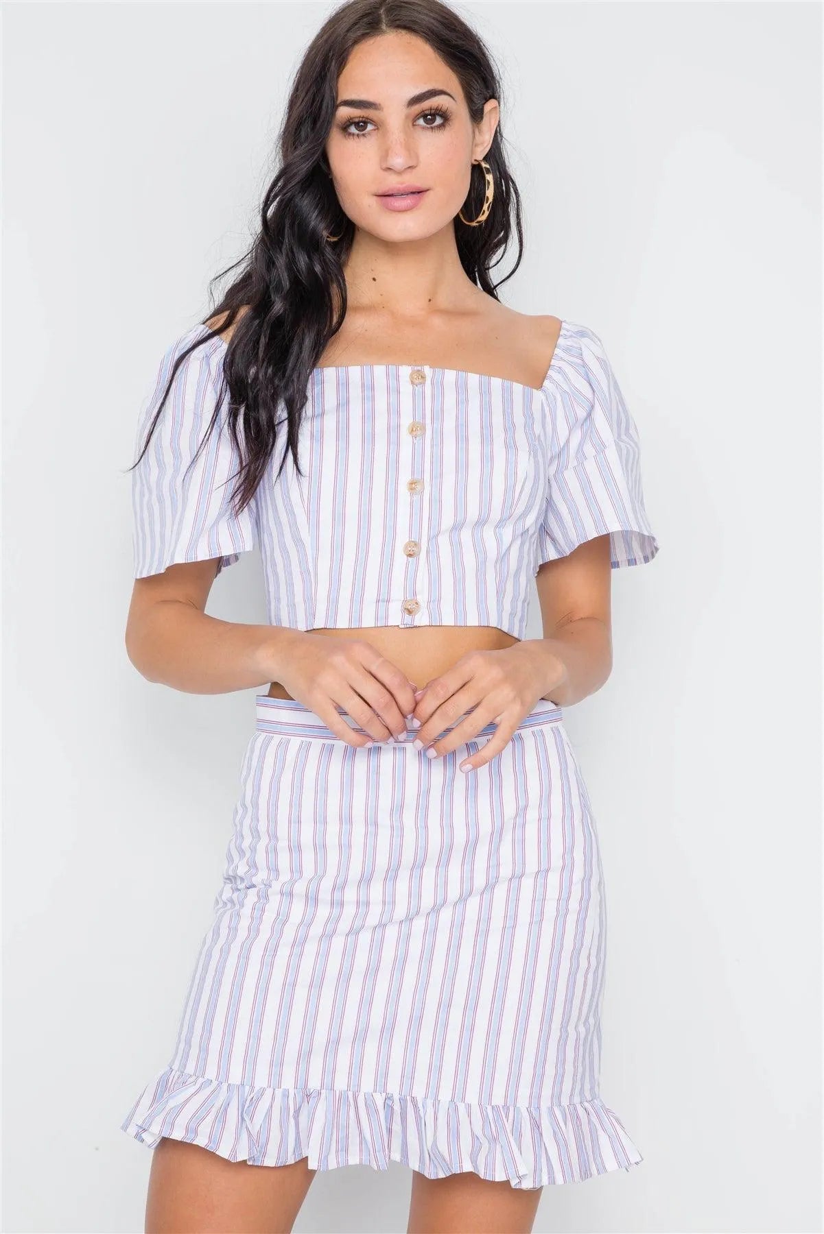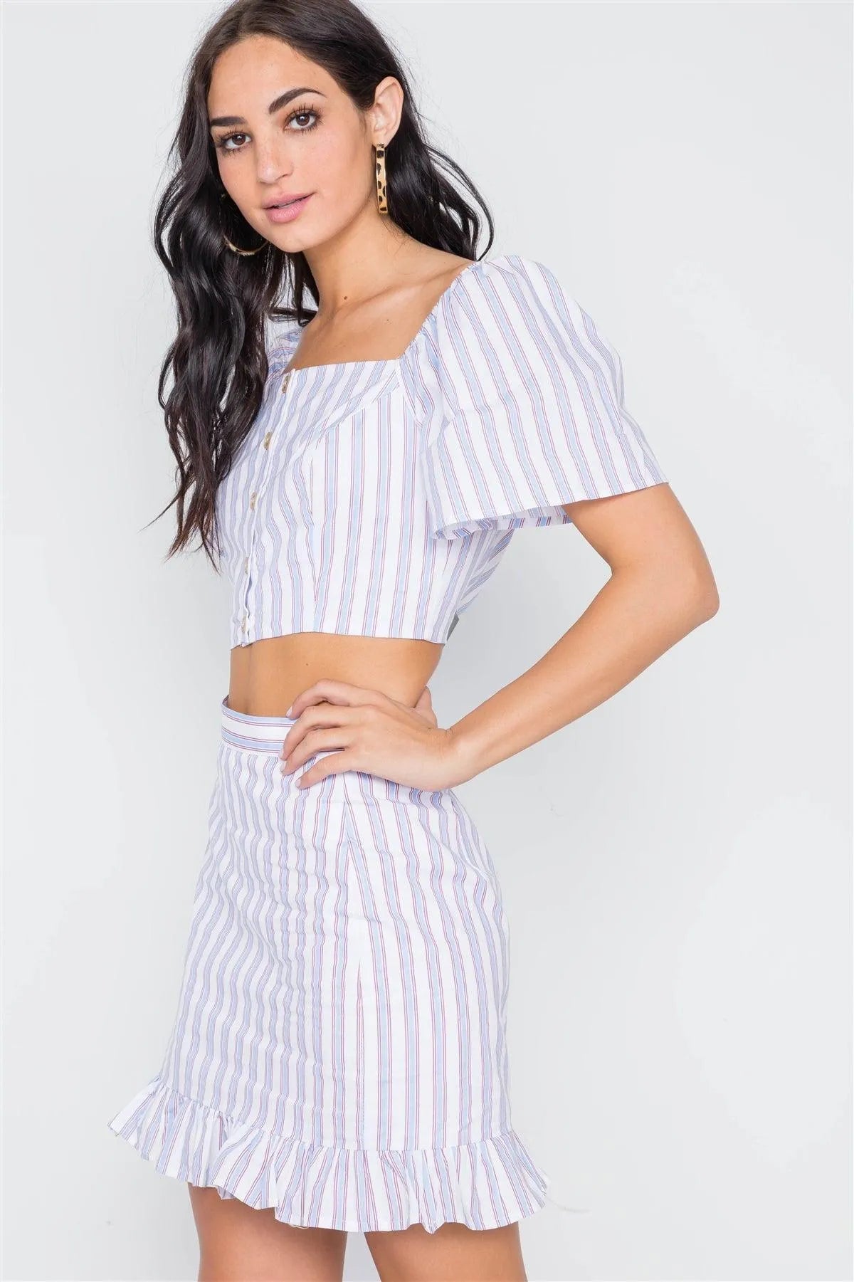Blue Red Stripe Two Piece Crop Top Ruffle Skirt Set /3-2-1
