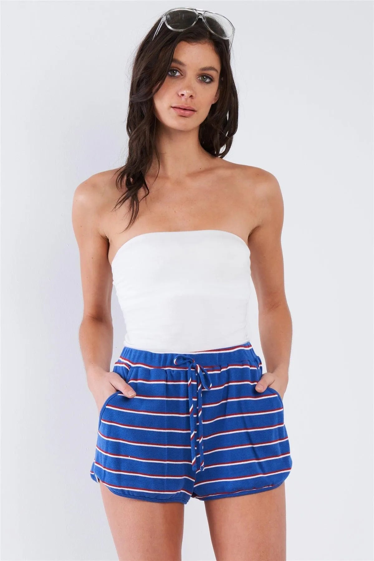 Blue Red & White Multi Stripe Casual Solid Hem Shorts