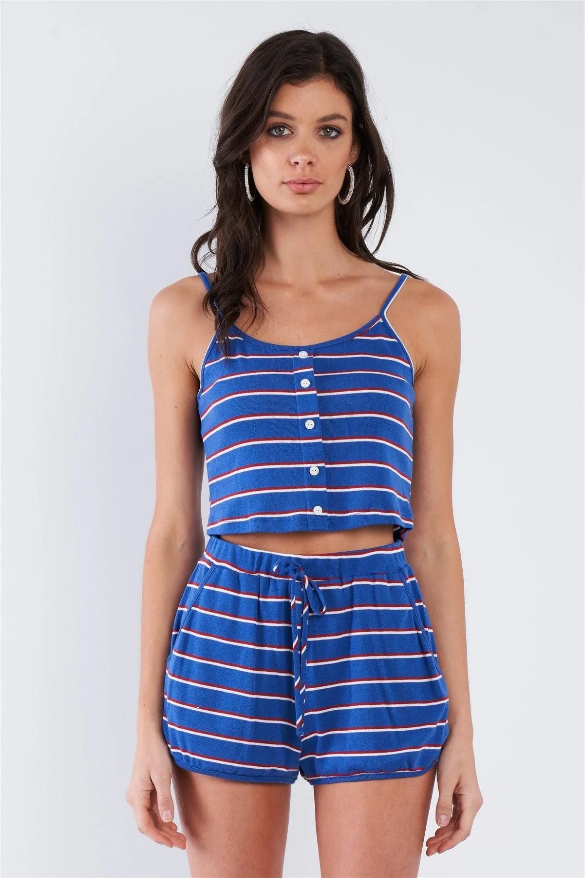 Blue Red & White Stripe Mock Front Button Crop & Casual Mini Short Loungewear Set /3-2-1