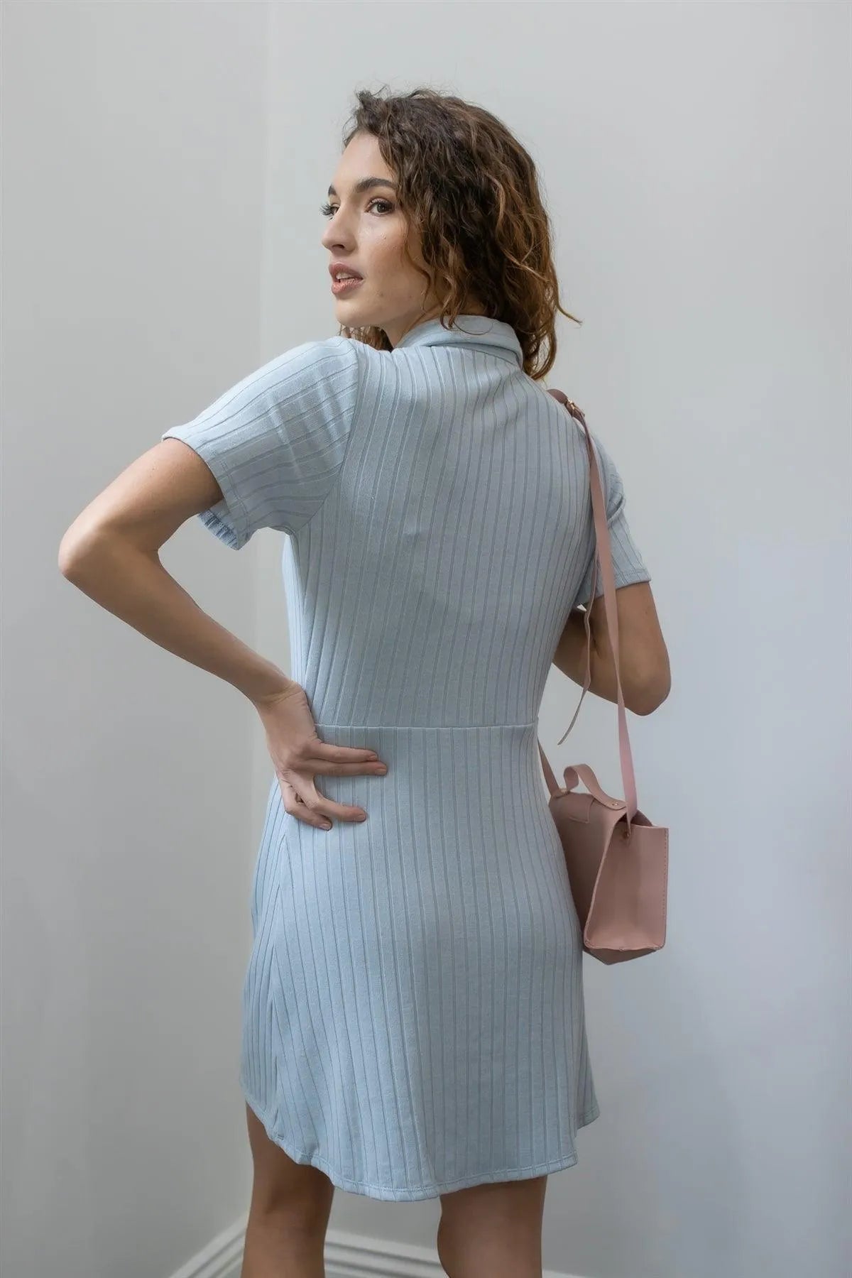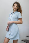 Blue Ribbed Front Button Up Collared Shirt Mini Dress /1-1-2-1