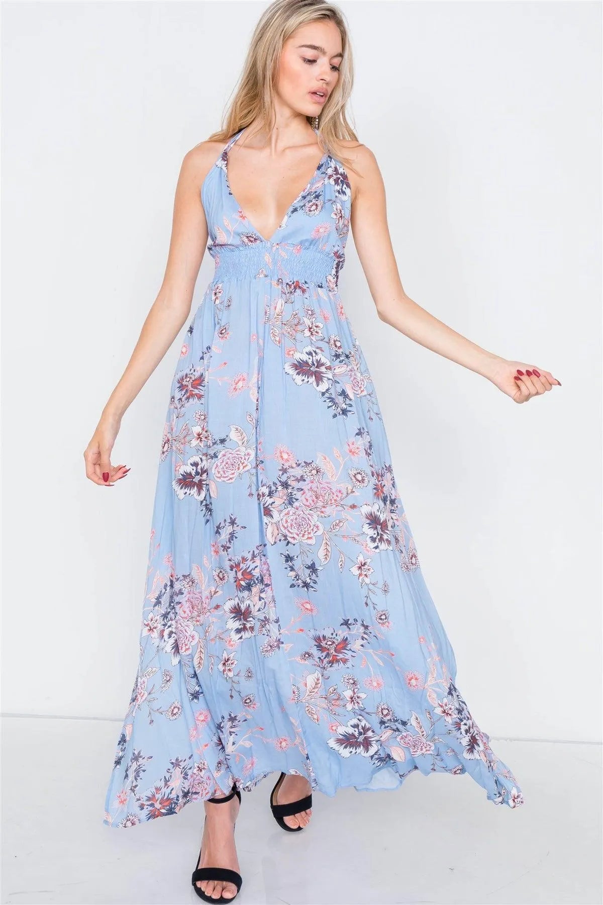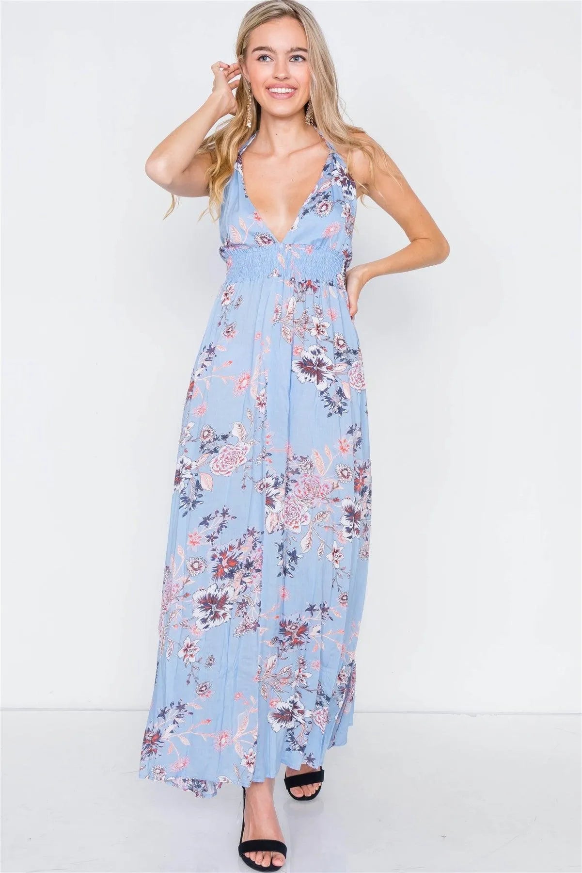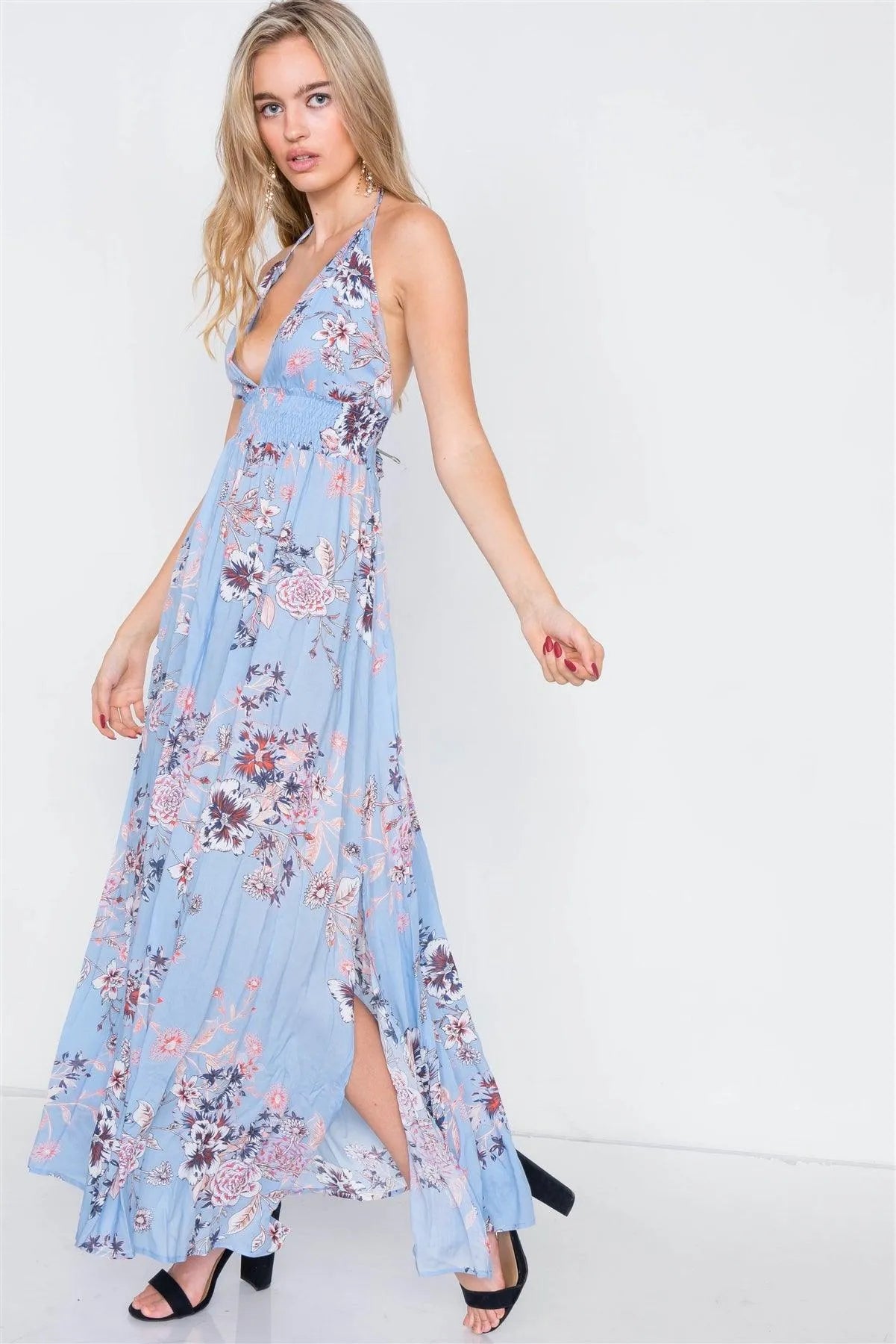 Blue Ruched Waist Backless Side Slit Maxi Dress /2-2-2
