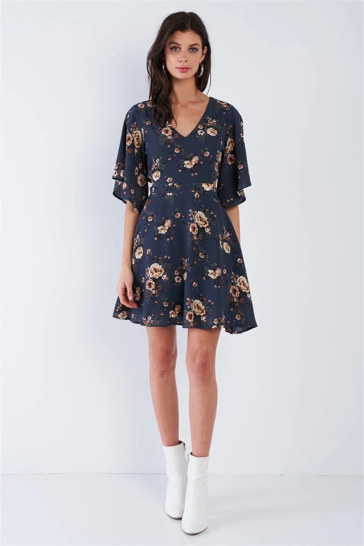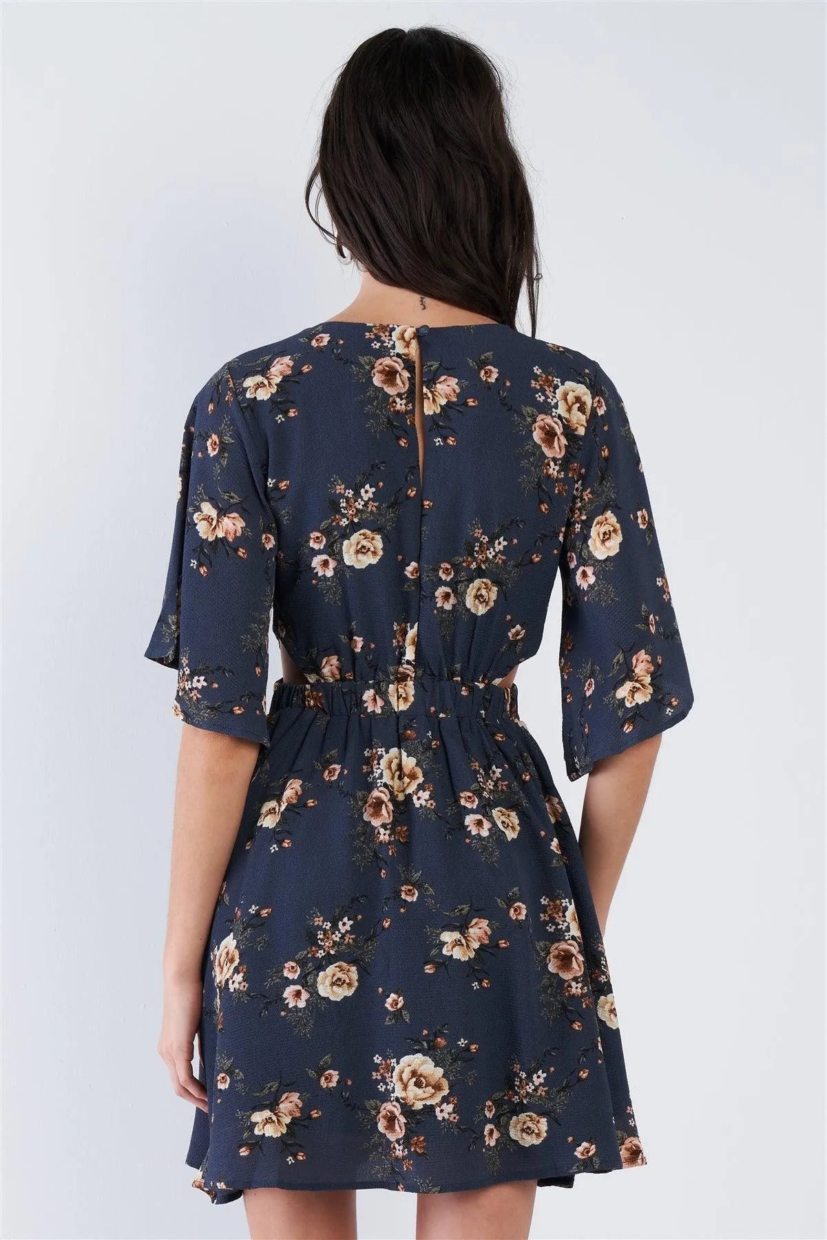Blue Side Cut Out Multi Floral Print Kimono Sleeve Mini Dress /1-2-1