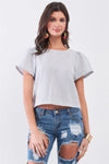 Blue Striped Self-Tie Back Triple Detail Puff Short Sleeve Exposed Back Crop Top /1-2-2-1