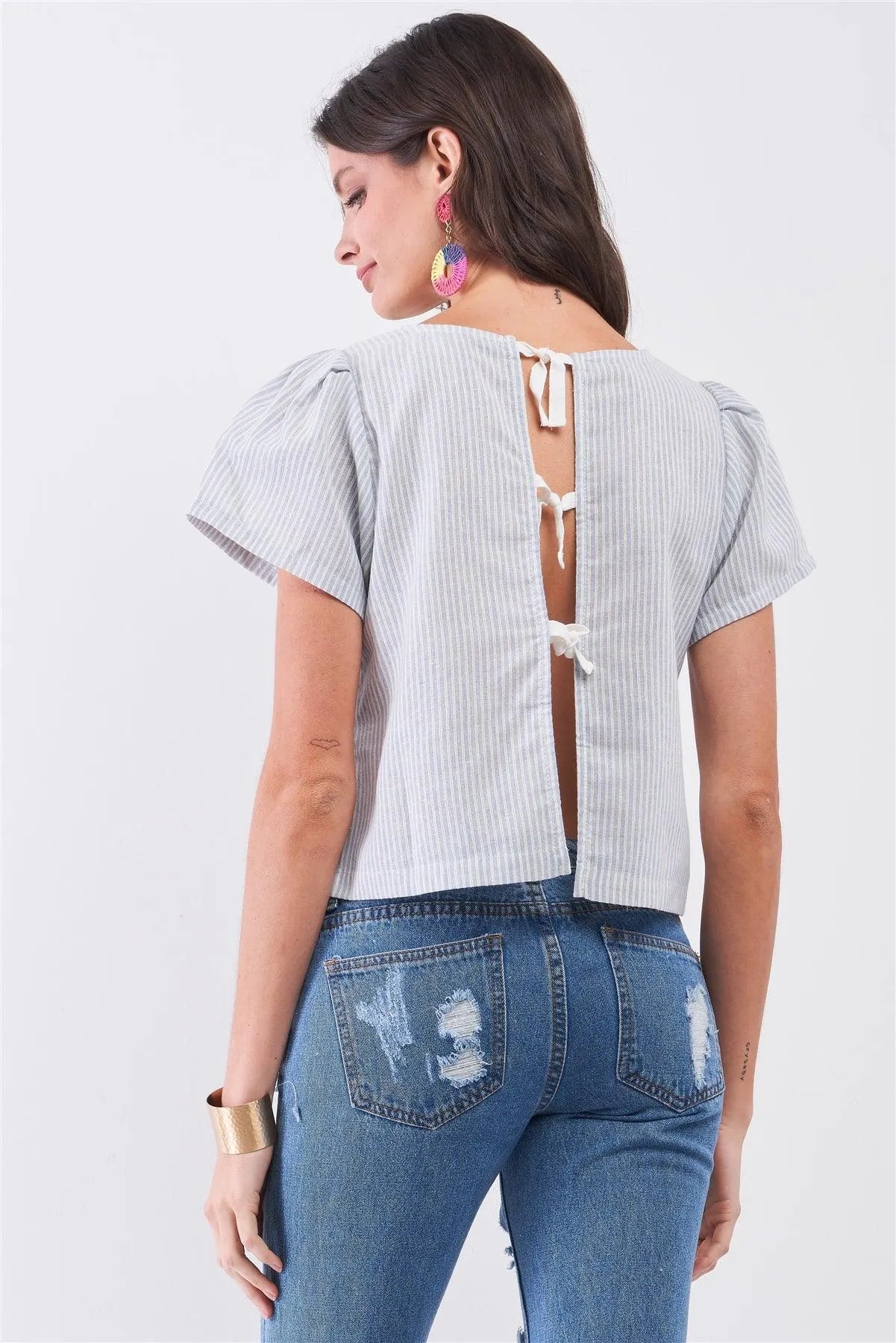 🖤 Item Features: Blue & white, stripe print, round neckline, slight puff shoulder short sleeve, exposed back triple self-tie strings detail, unlined, cropped length, non-stretch, semi-sheer, casual, eco, breathable, comfy, spring/summer collection