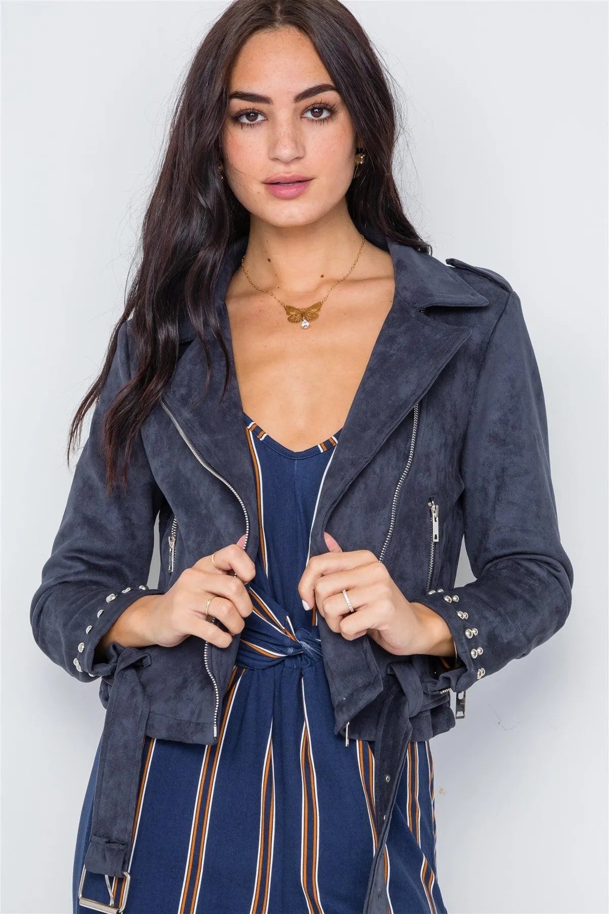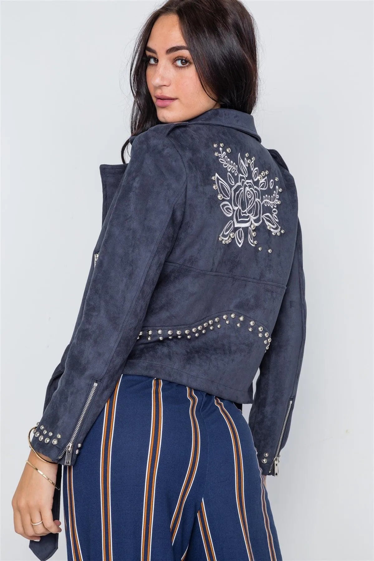 Blue Studded Embroidery Faux Suede Moto Jacket