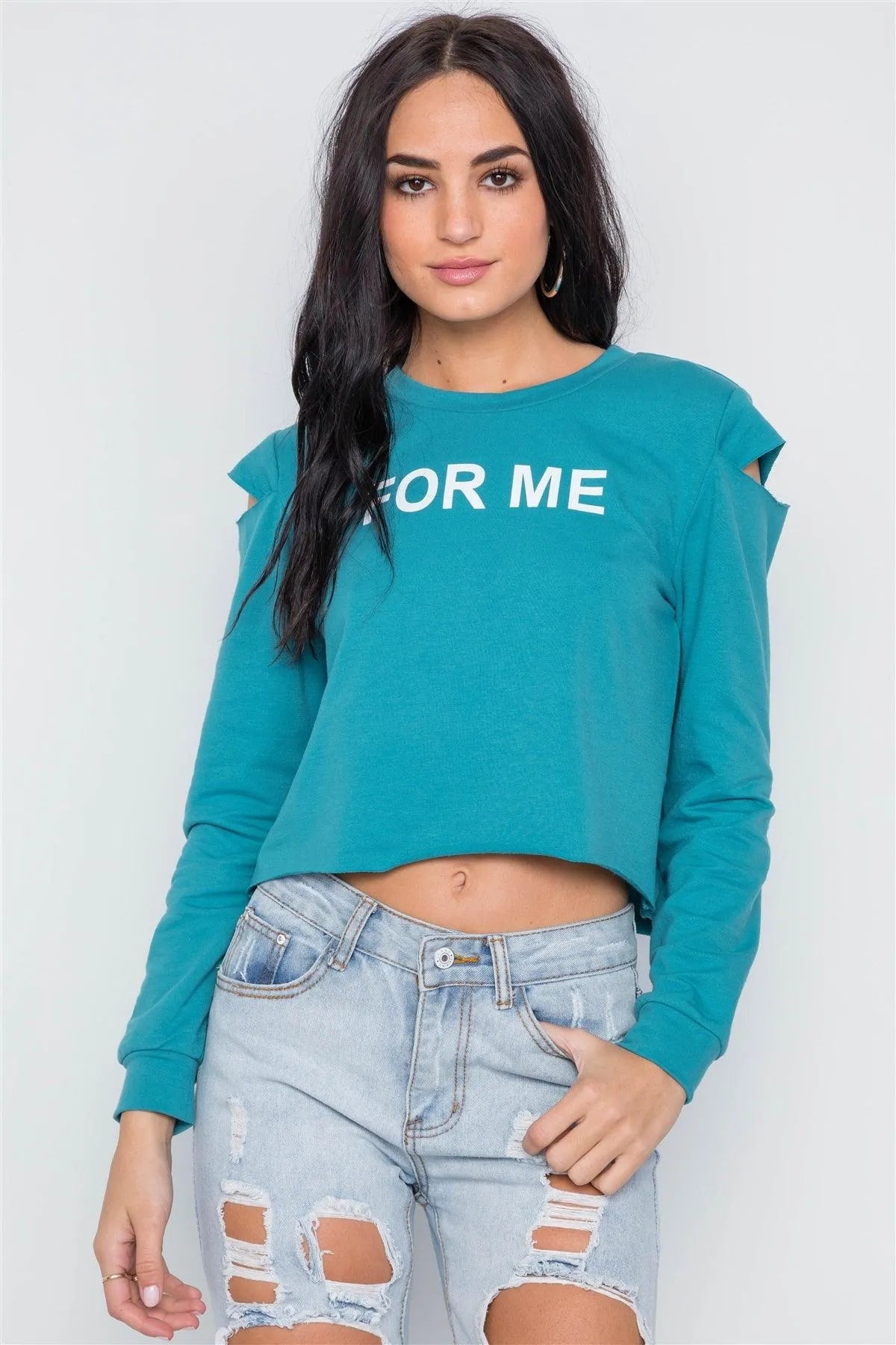 Top features: long sleeves, cold shoulder, raw hem, graphic print: "FOR ME" round neck, unlinedModel is 5'8 and wearing Small (Waist: 24", Bust: 32A, Hips: 34")Item Measurements: Length: 18", Bust: 34" Sleeves: 20"True to sizeAvailable in Rust