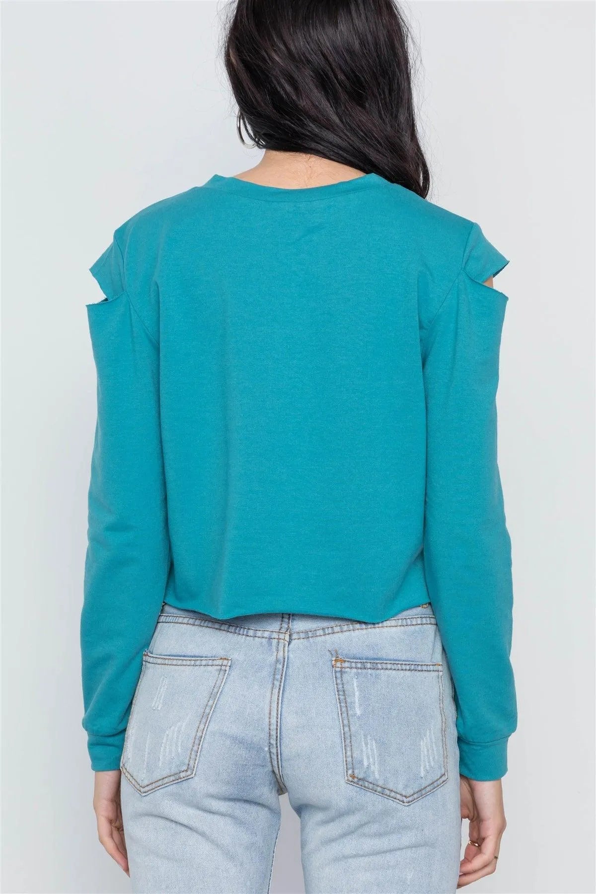 Blue Turquoise Cold Shoulder Long Sleeve Graphic Top /2-2-2