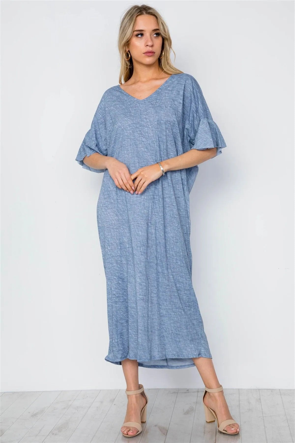 Blue Twist Back Short Sleeve Maxi Boho Shirt Dress