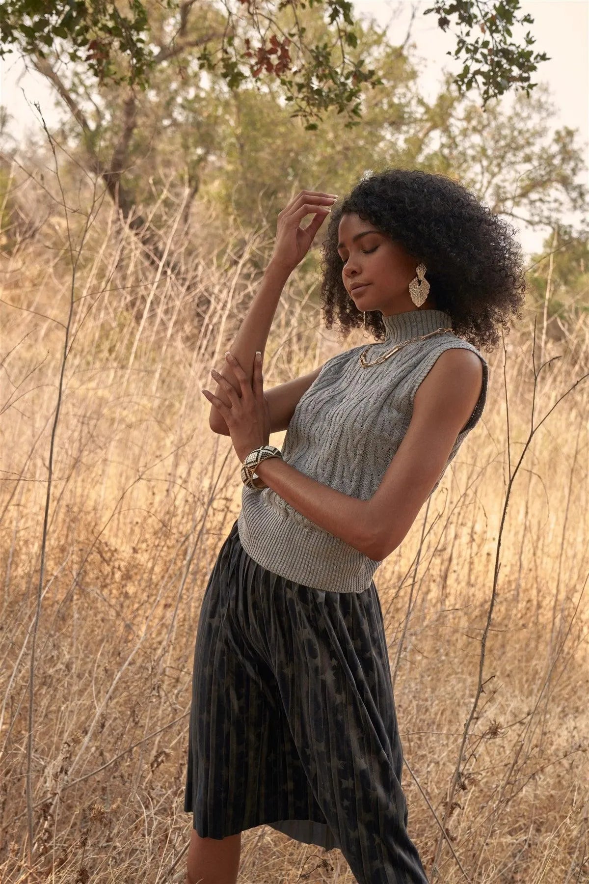 Starstruck Dusty Blue Velvet Star Print High Waisted Pleated Midi Skirt /2-2-2