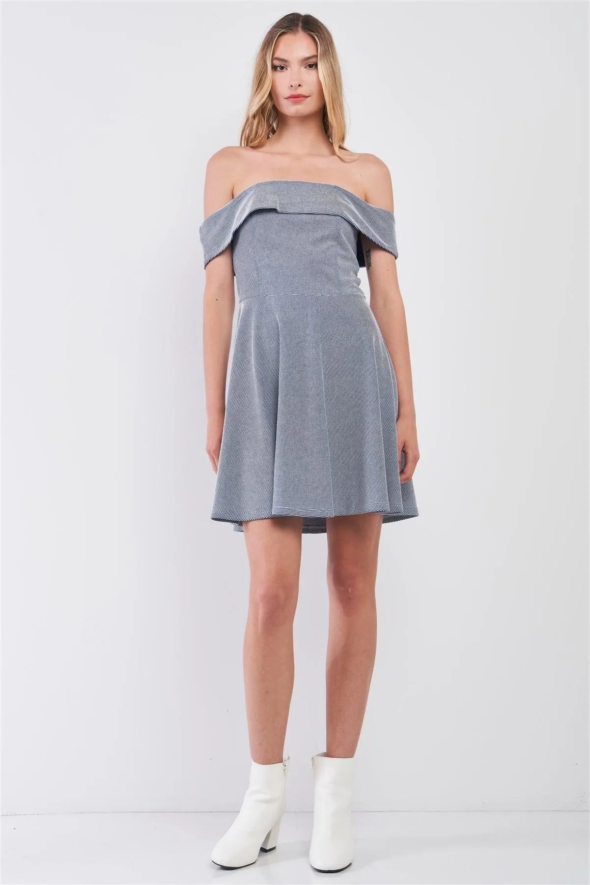 Blue & White Striped Sleeveless Off-The-Shoulder A-Line Flare Mini Dress /1-2-2-1