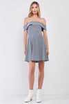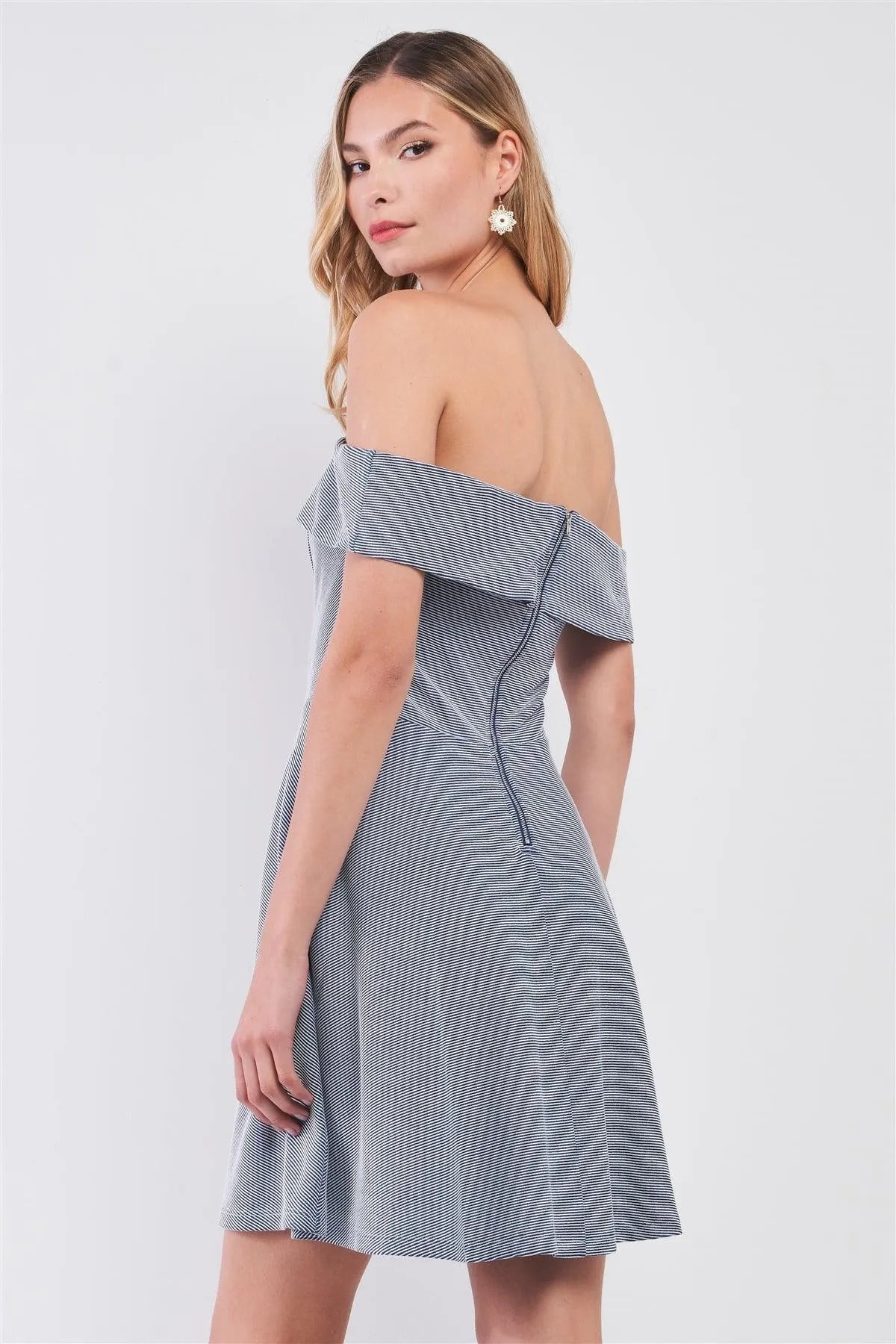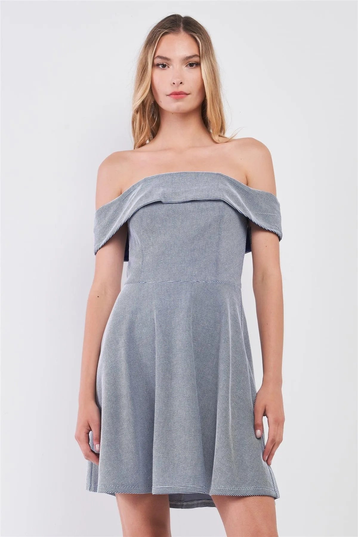 Blue & White Striped Sleeveless Off-The-Shoulder A-Line Flare Mini Dress /1-2-2