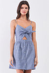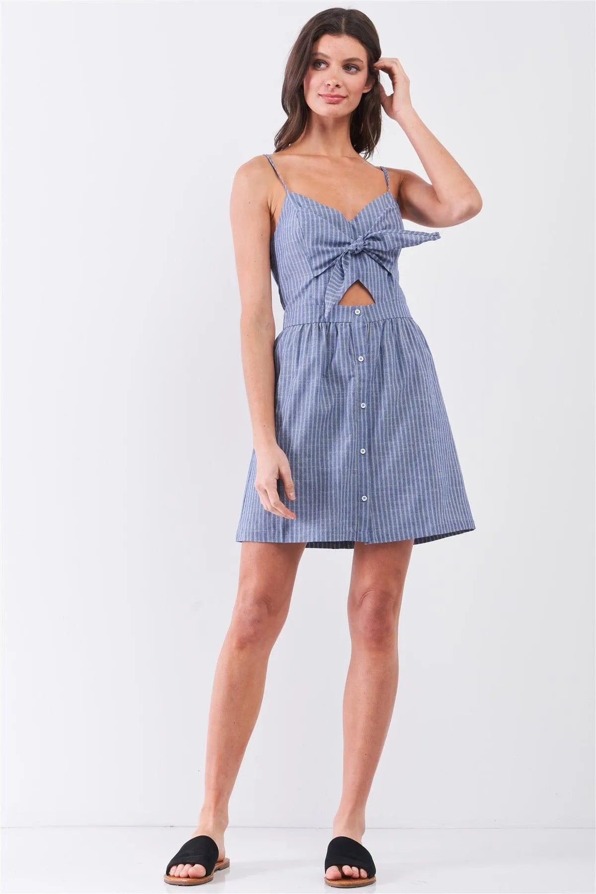 🖤 Item features: Blue & white, striped print, sleeveless, adjustable shoulder straps, V-neck, self-tie front, cut-out detail, button down bottom front, back zipper and inner hook&eye closures, lined, non-stretch, mini length, casual, cute, lightweight, spring/summer collection
