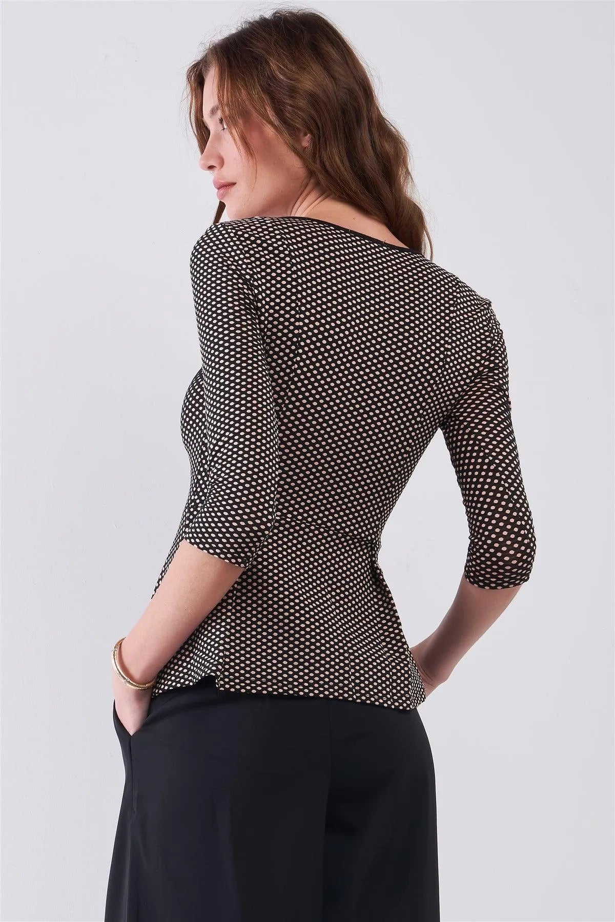 Blush & Black Polka Dot Pattern Print Scoop Neck Midi Sleeve Fit & Flare Top /2-1-3-1