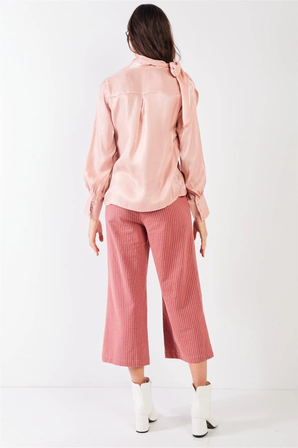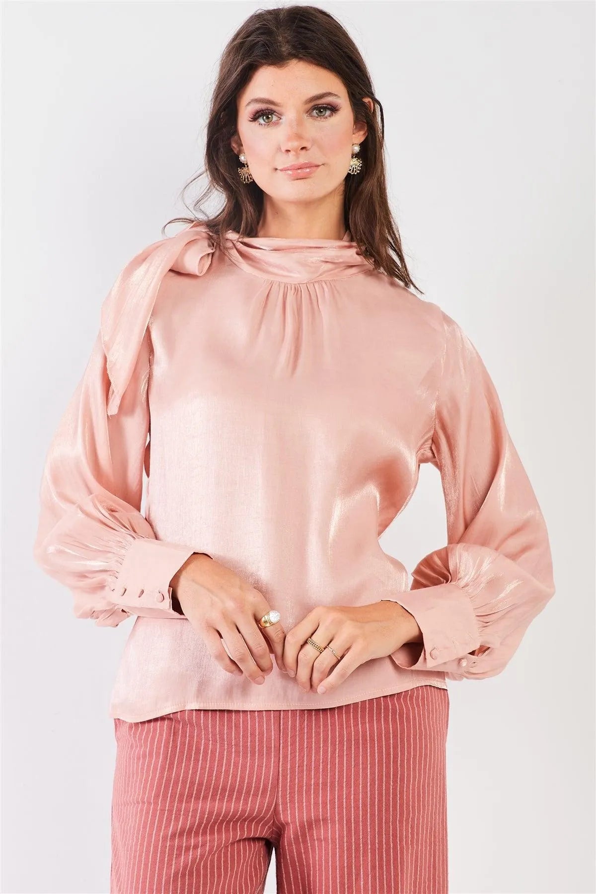 🖤Item Features: Blush, solid color, shiny chiffon fabric, long bishop sleeves with wide buttoned cuffs, elegant self-tie neck detail, relaxed fit, unlined, non-stretch, non-sheer, casual chic, elegant, delicate, party outfit, romantic, date look, fall/winter collection