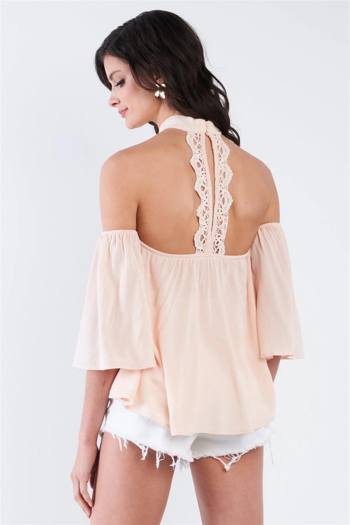 Top Features: Solid blush, halter neck, choker crochet detail, cold shoulder, bell sleeves, back button neck closure, light weight, unlined, stretchy, spring, summer, boho, casual Item Measurements: Length: 25" , Bust: 30"Model is 5'9" and wearing size Small (Waist: 23.5", Bust: 32B, Hips: 36")Item pre-packed with hang tagsTrue to Size