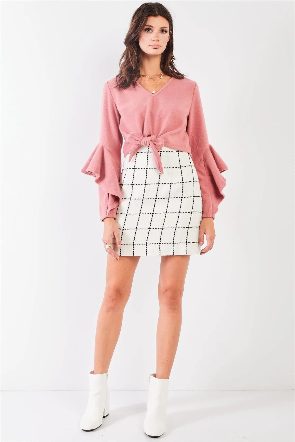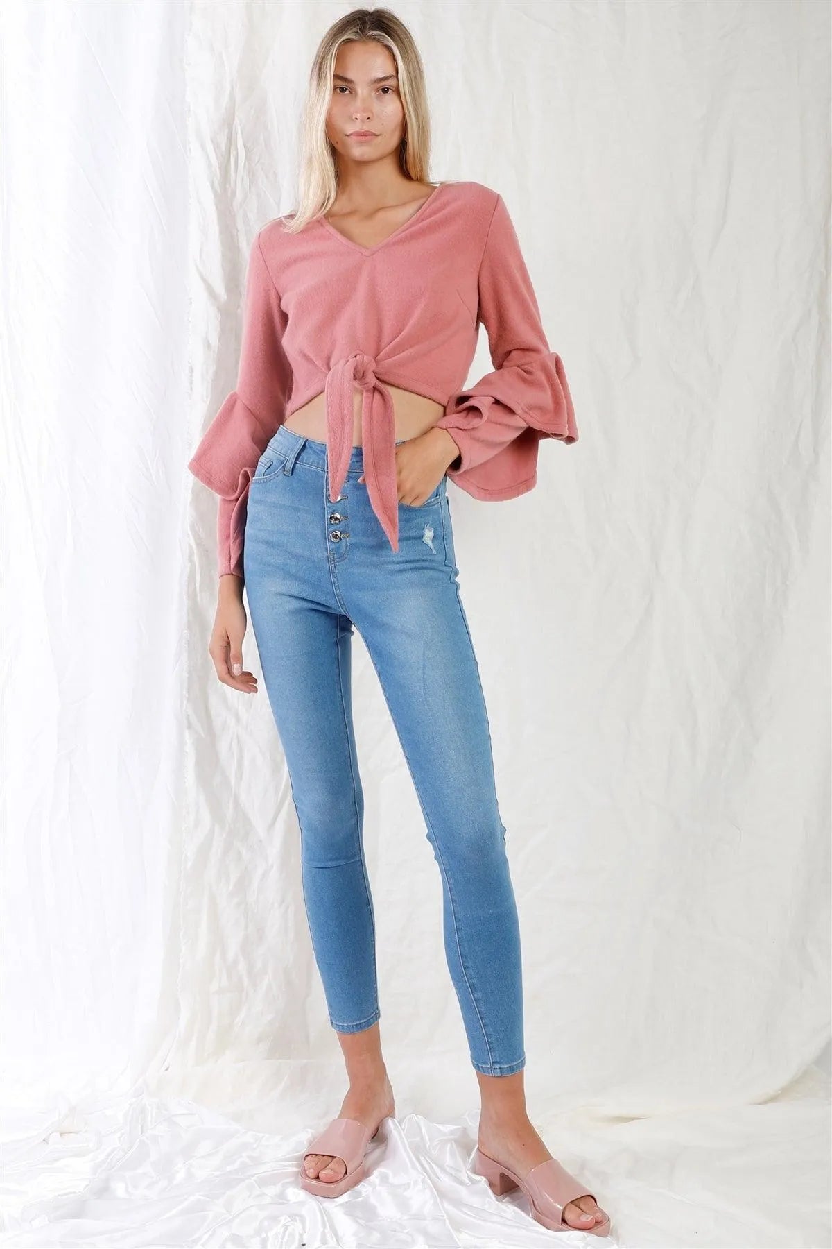 Blush Fuzzy Long Ruffle Sleeve V-Neck Self-Tie Front Detail Cropped Top /2-1-3