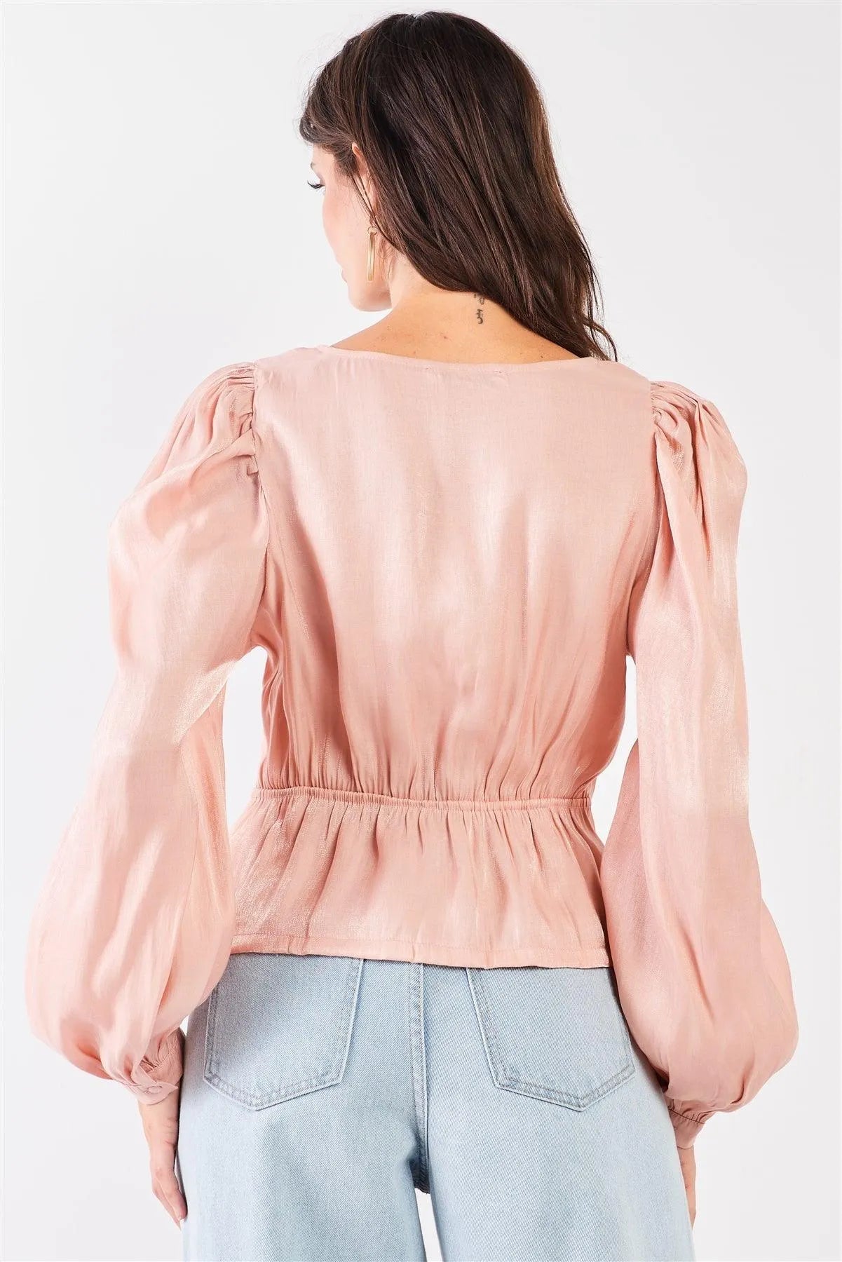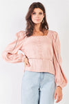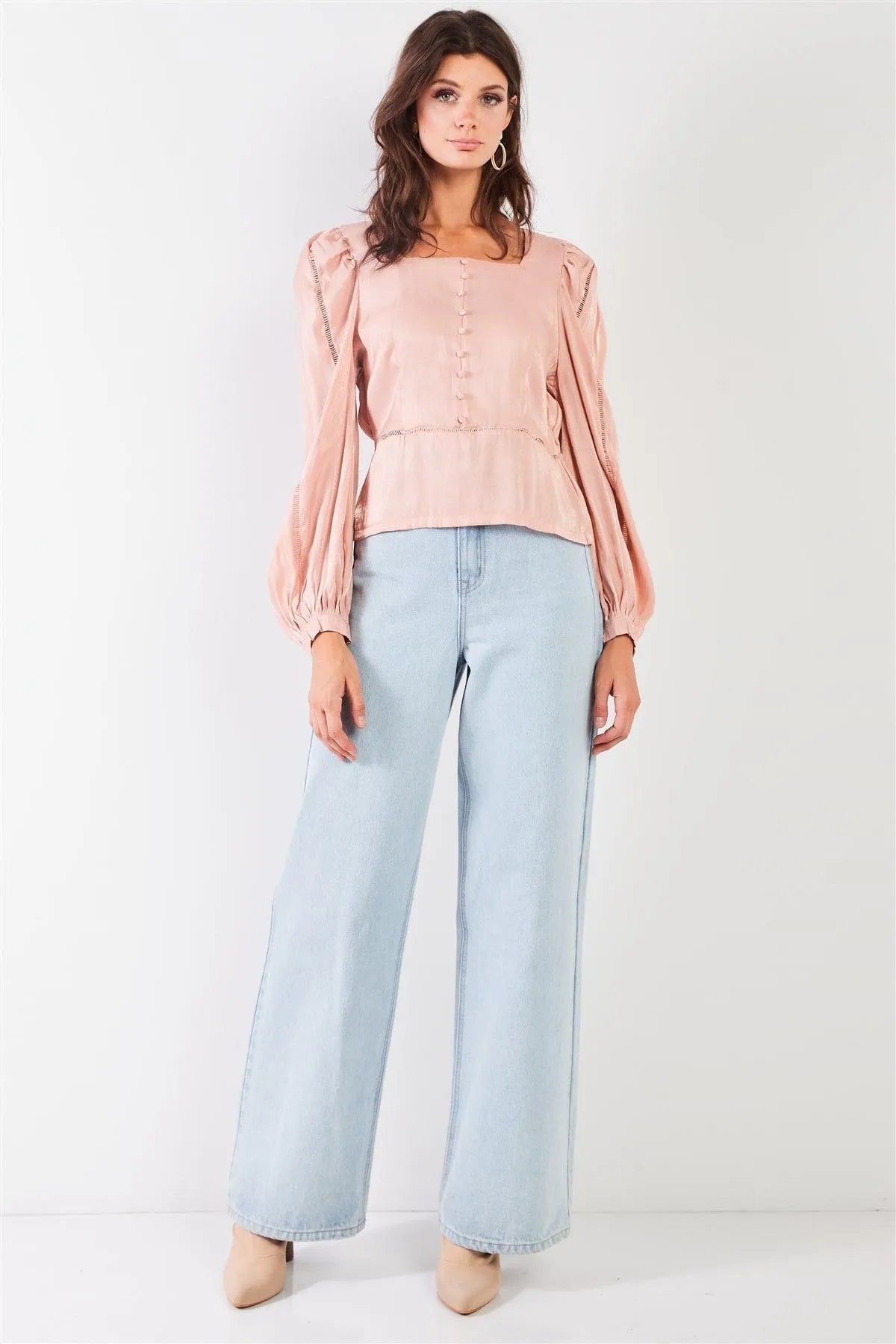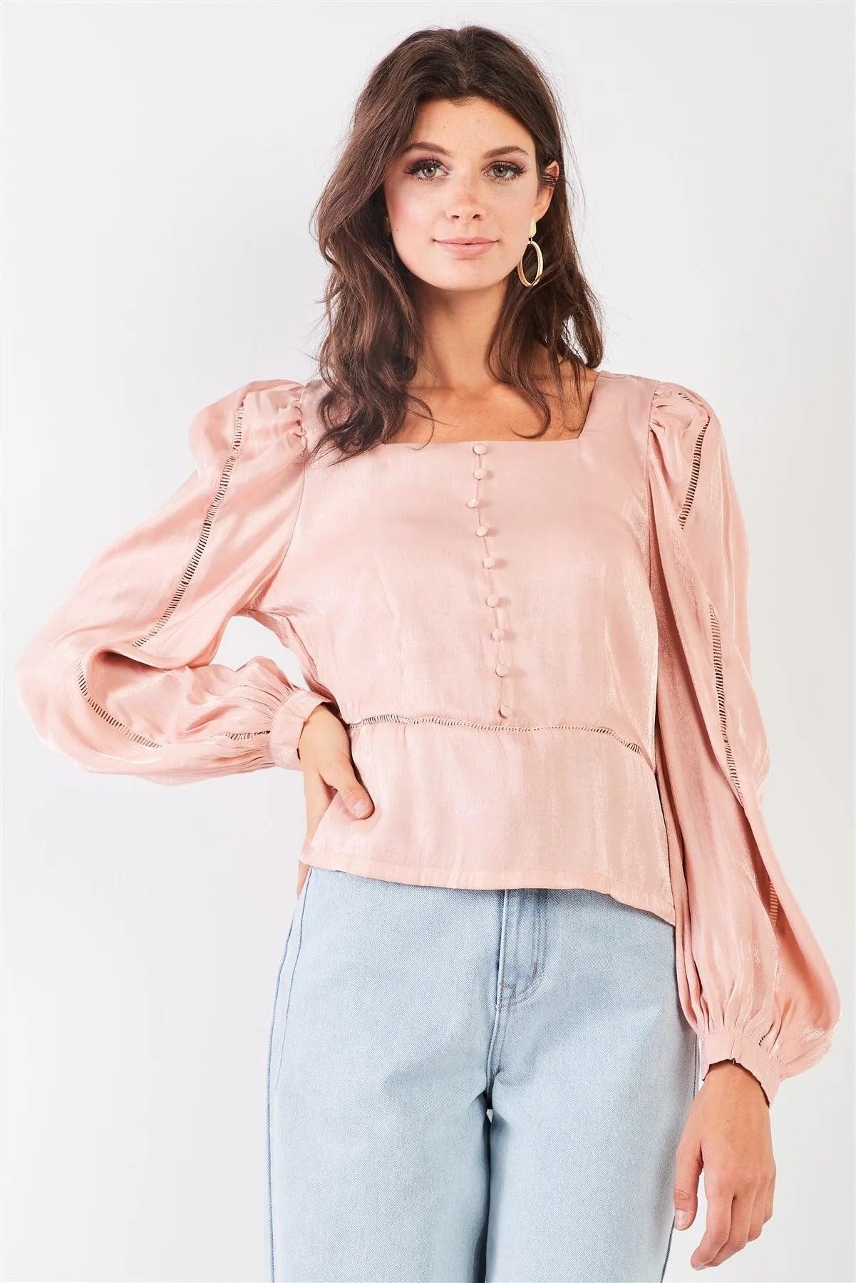Blush Glossy Chiffon Square Neck Long Bishop Sleeve Mock Button Down Top /2-2-2