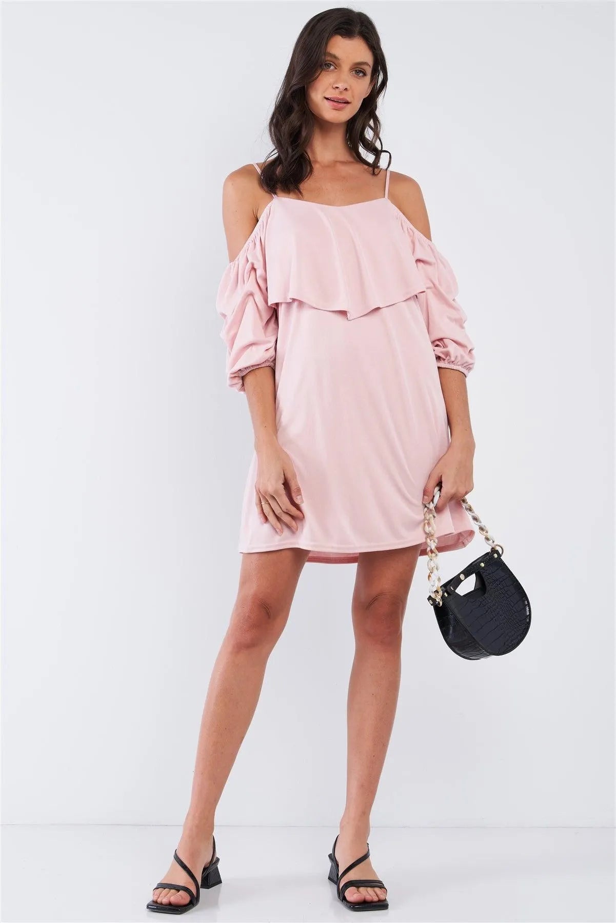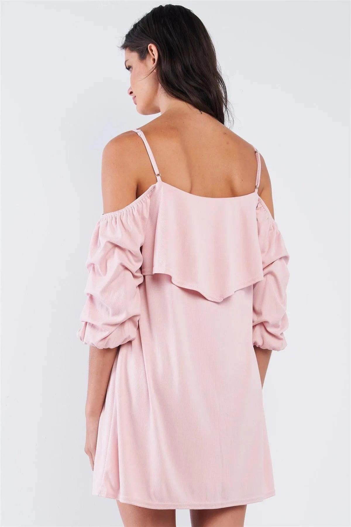 Blush Pink Loose Fit V-Neck Off-The-Shoulder Gathered Sleeve Detail Mini Dress /2-2-1