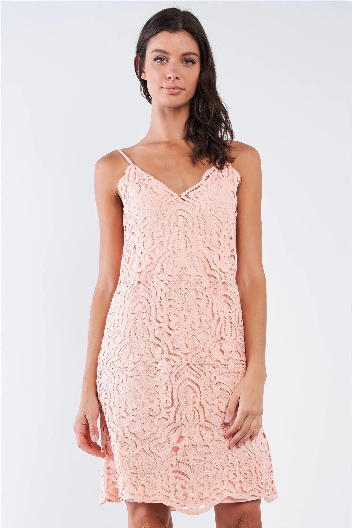 🖤 Item features: Blush pink, top crochet layer, v-neck, lined, non-sheer lining, mini length, adjustable straps, non-stretch, relaxed fit, party dress, date night, romantic look.