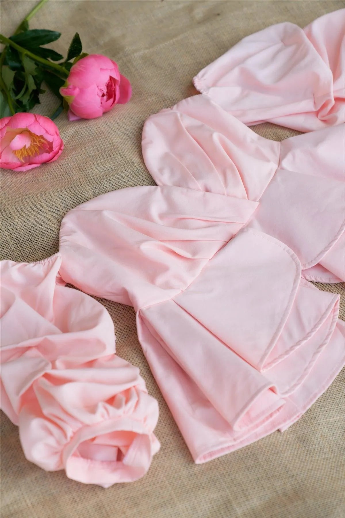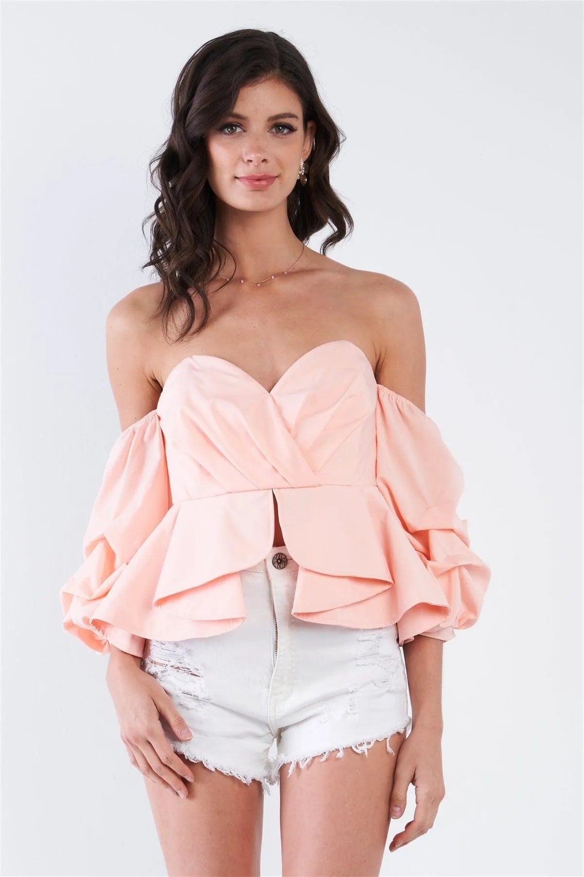 Blush Off Shoulder Puff Sleeve Ruffle V-Neck Peplum Crop Top /2-2-2