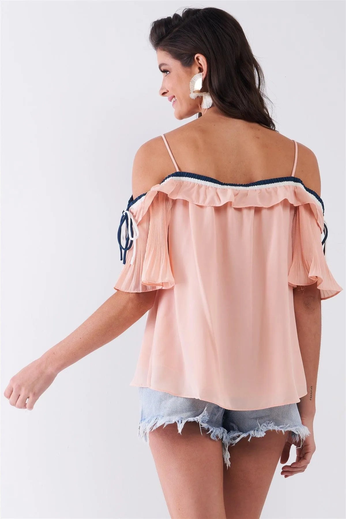 Blush Pink Off-The-Shoulder Short Pleated Sleeve Ruffle Trim Relaxed Top /1-2-2-1
