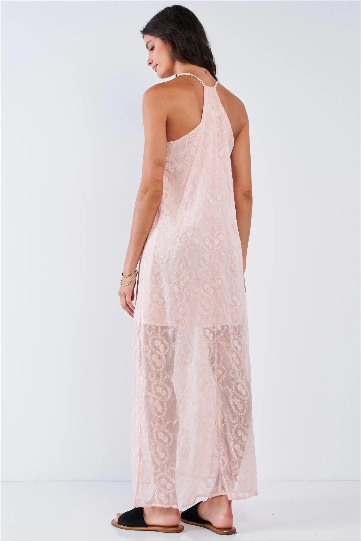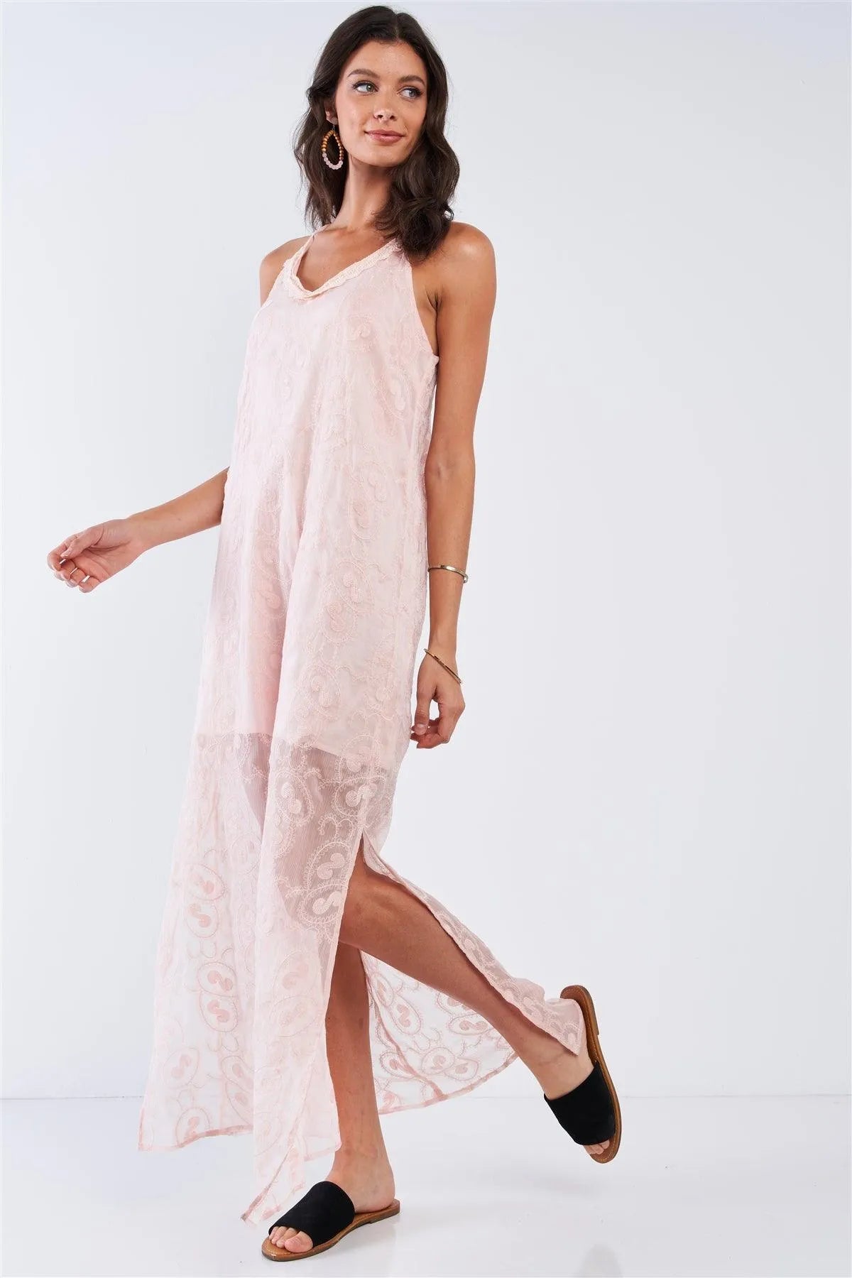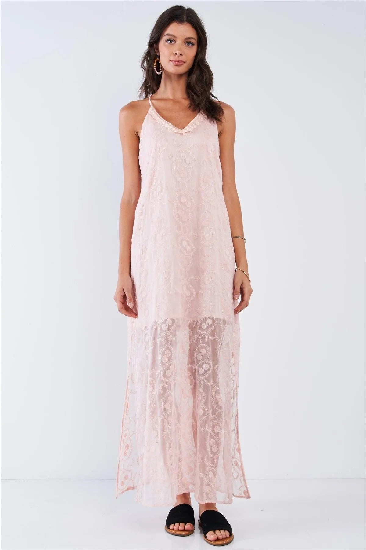 Blush Pink Boho Chic Embroidered Sleeveless V-Neck Festival Maxi Dress /1-2-2-1