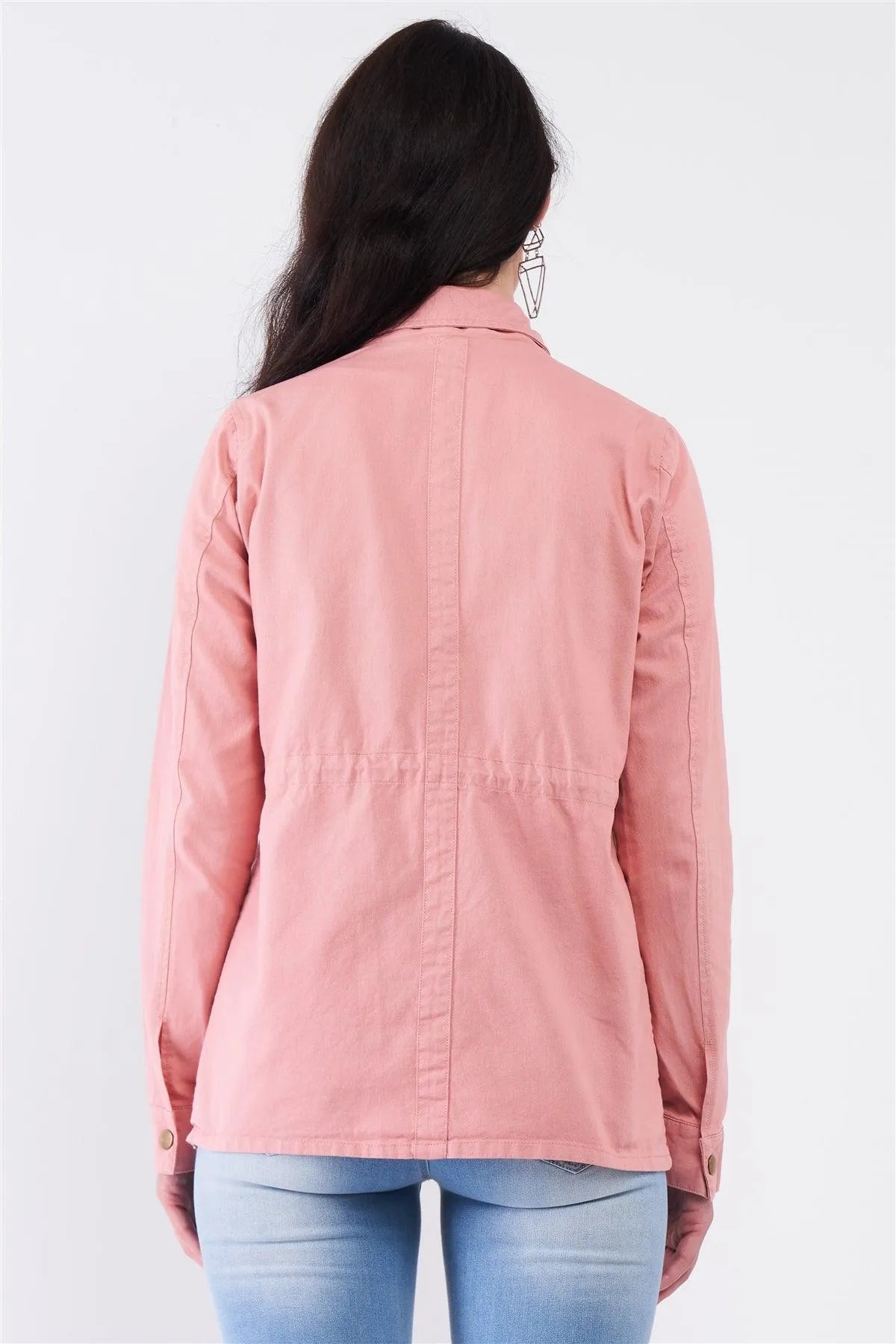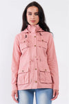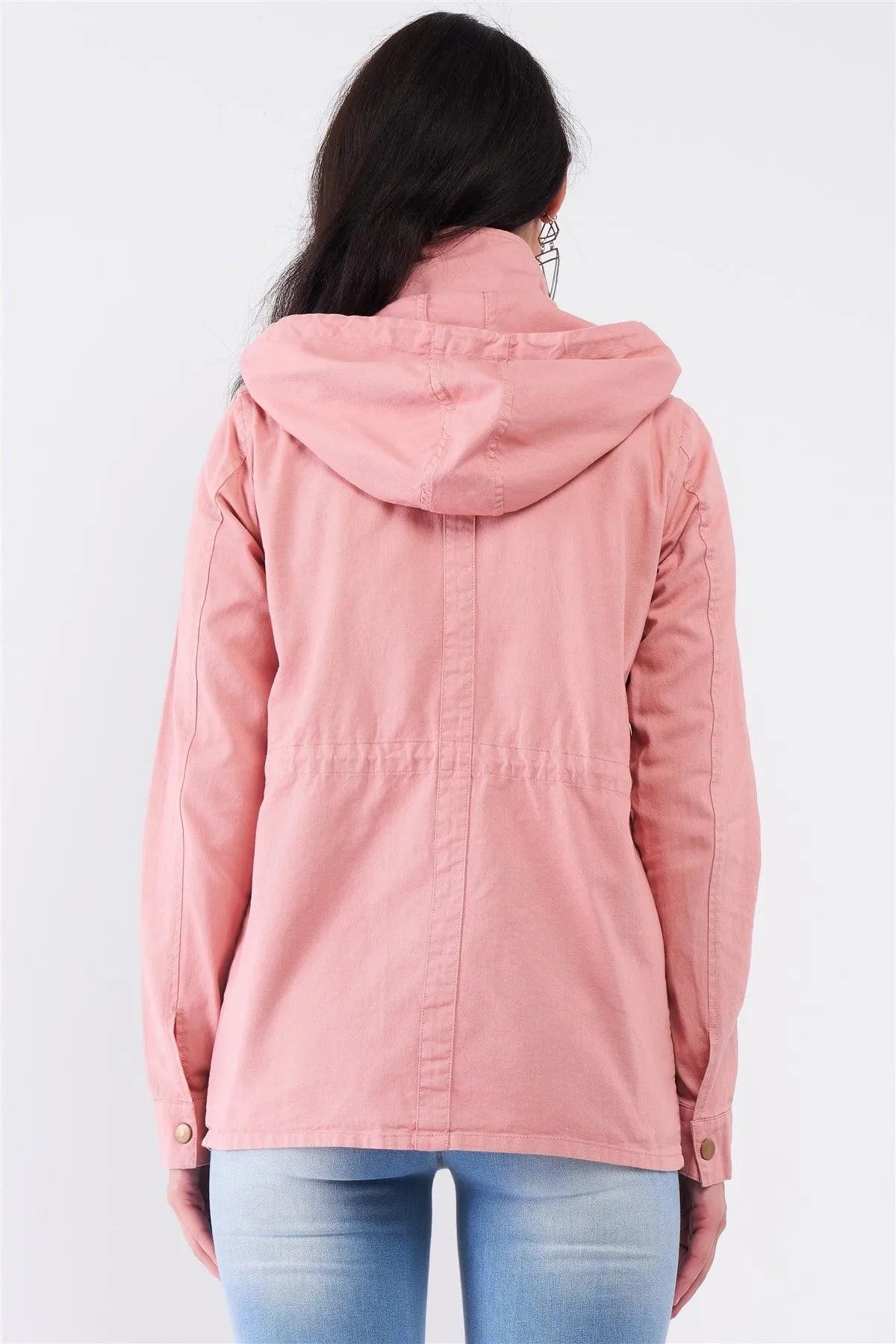 Washed Blush Pink Cotton Front Zip-Up & Button Down Detachable Hood Detail Utility Jacket /1-2-2-2
