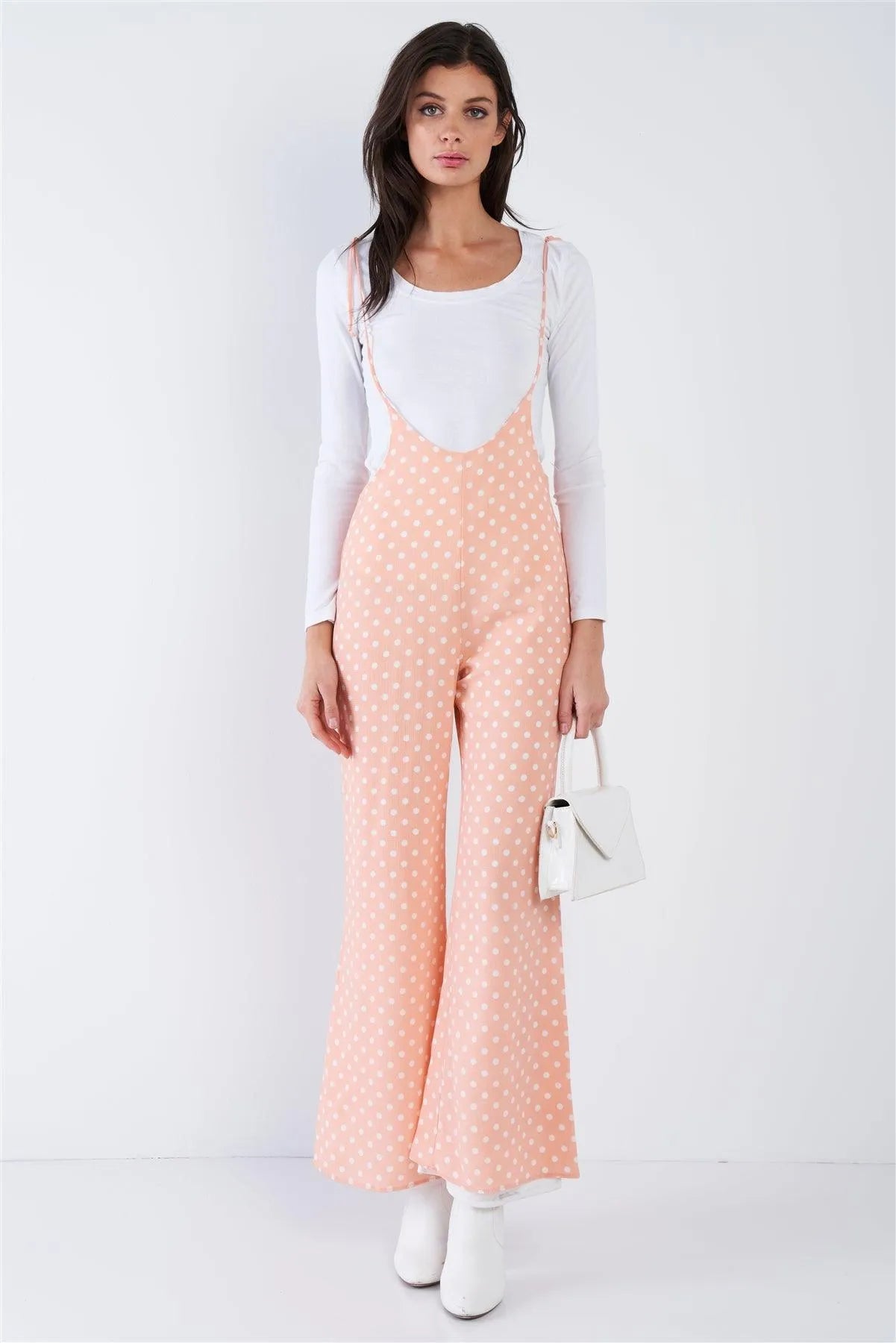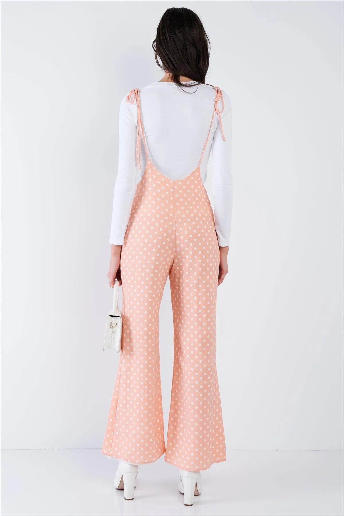 Blush Pink & White Polkadot Self Tie Spaghetti Strap Wide Leg Jumpsuit /3-2-1