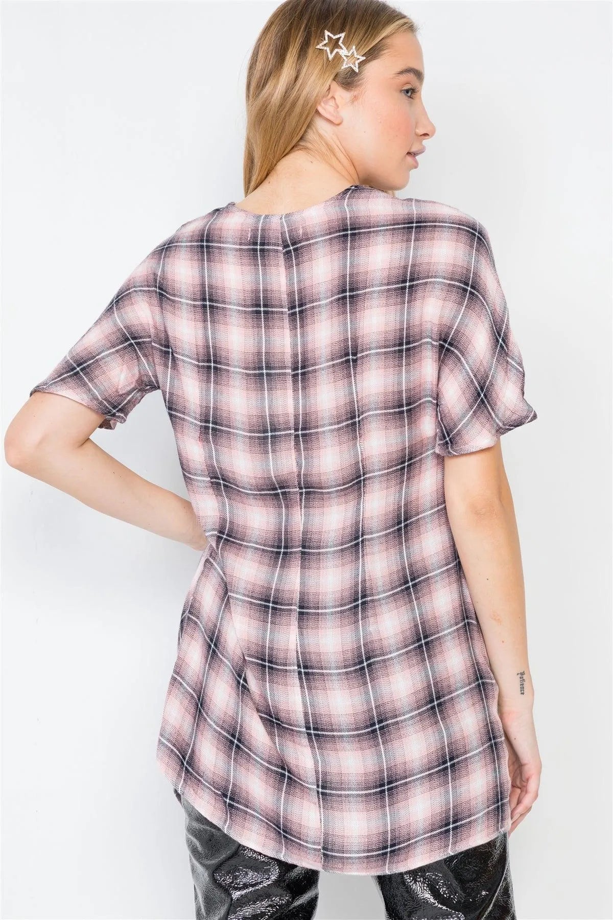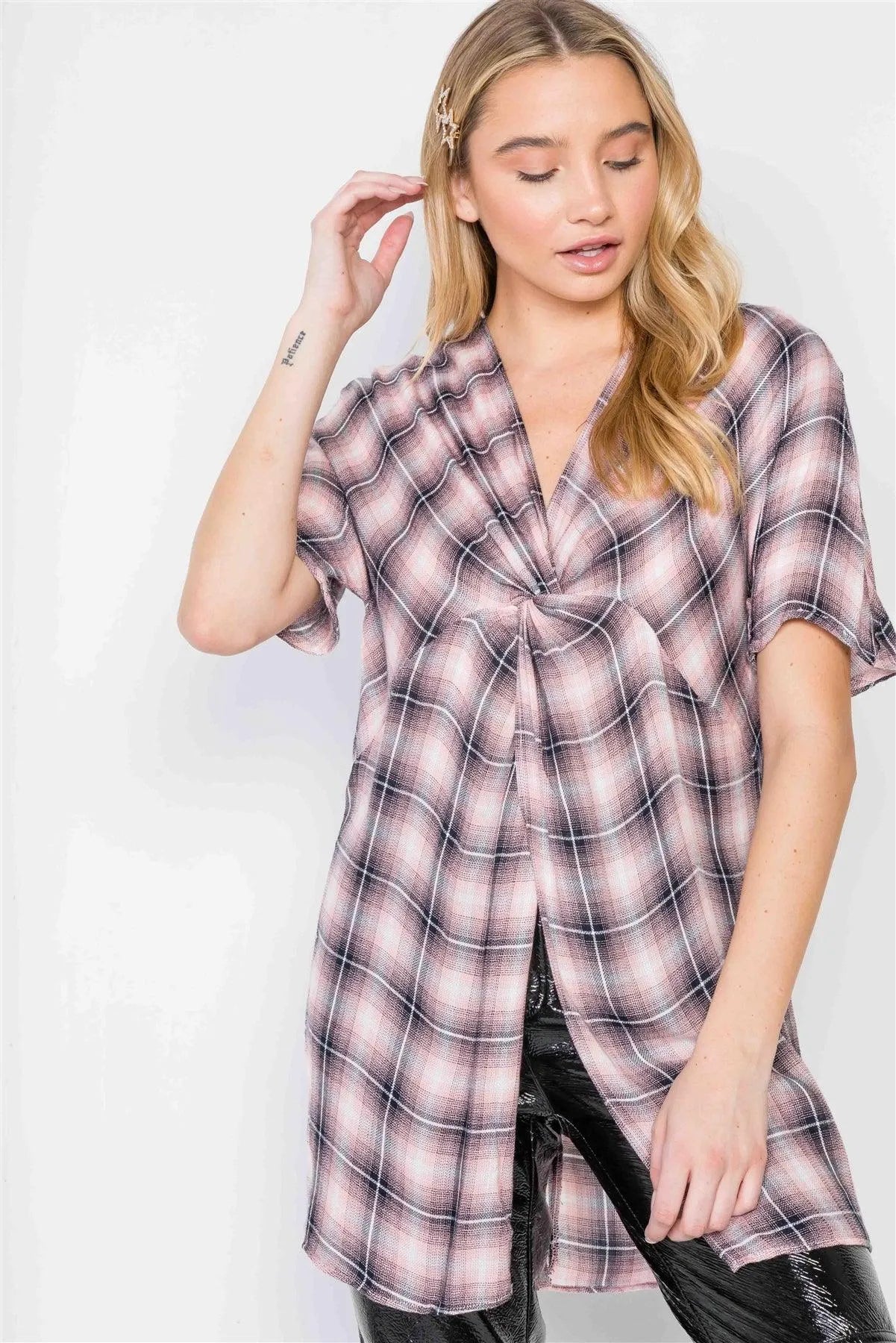 Blush Plaid Short Sleeve Front-Twist Top /3-2-1