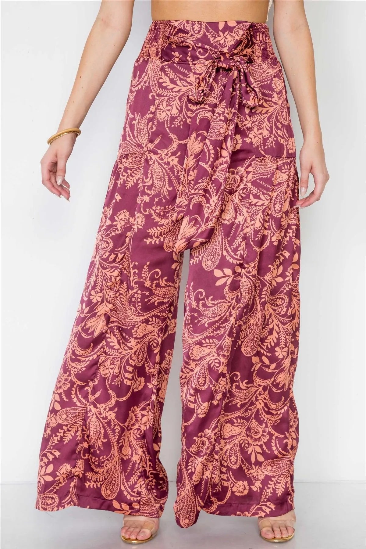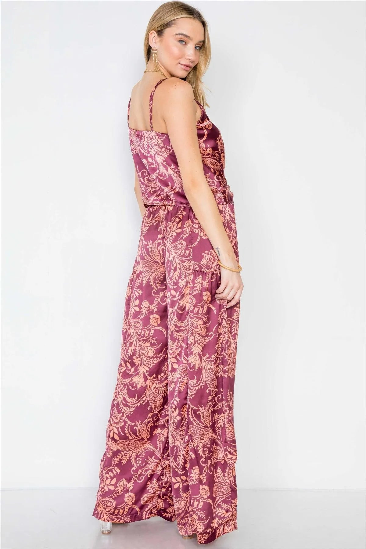 Top features: adjustable cami straps, v-neck, floral/paisley print allover, front twist detailing at hem, no stretch, unlinedPants features: high waisted, smoked waist with self front tie, floral/paisley print allover, wide leg, no stretch, unlinedModel is 5'8 wearing a size Small (Waist: 24", Bust: 32B, Hips: 34")Size Small Top Measurements: Length: 18", Bust: 34Size Small Pant Measurements: Length: 45", Waist: 24"True to size