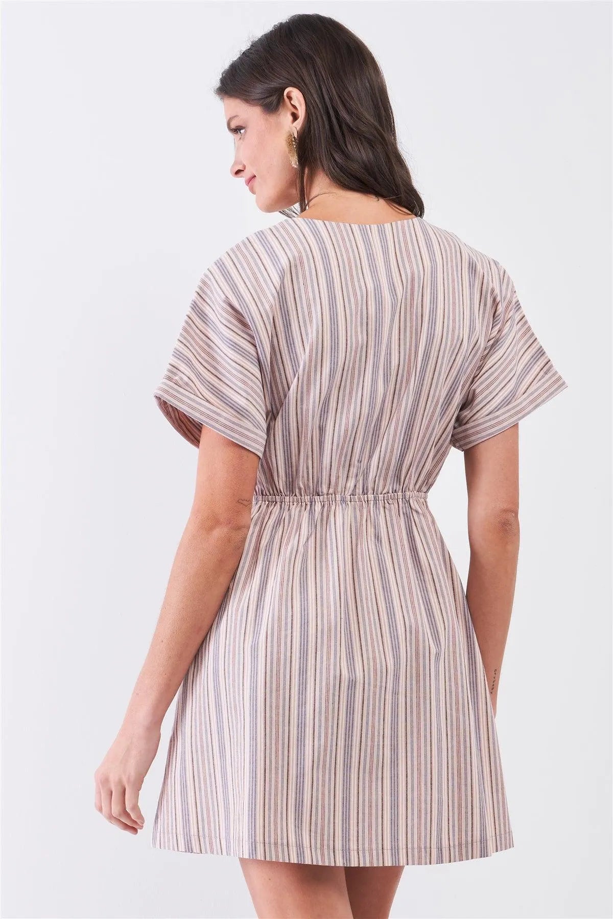 🖤 Item Features: Blush, multicolor stripe print, plunging self-tie V-neckline, cut-out front detail, short wide lapeled sleeve, elasticized waistband, button-down bottom front, mini length, relaxed fit, unlined, casual, retro style, vintage vibe, cute, flirty, comfy, breathable, 100% cotton, eco, spring/summer collection