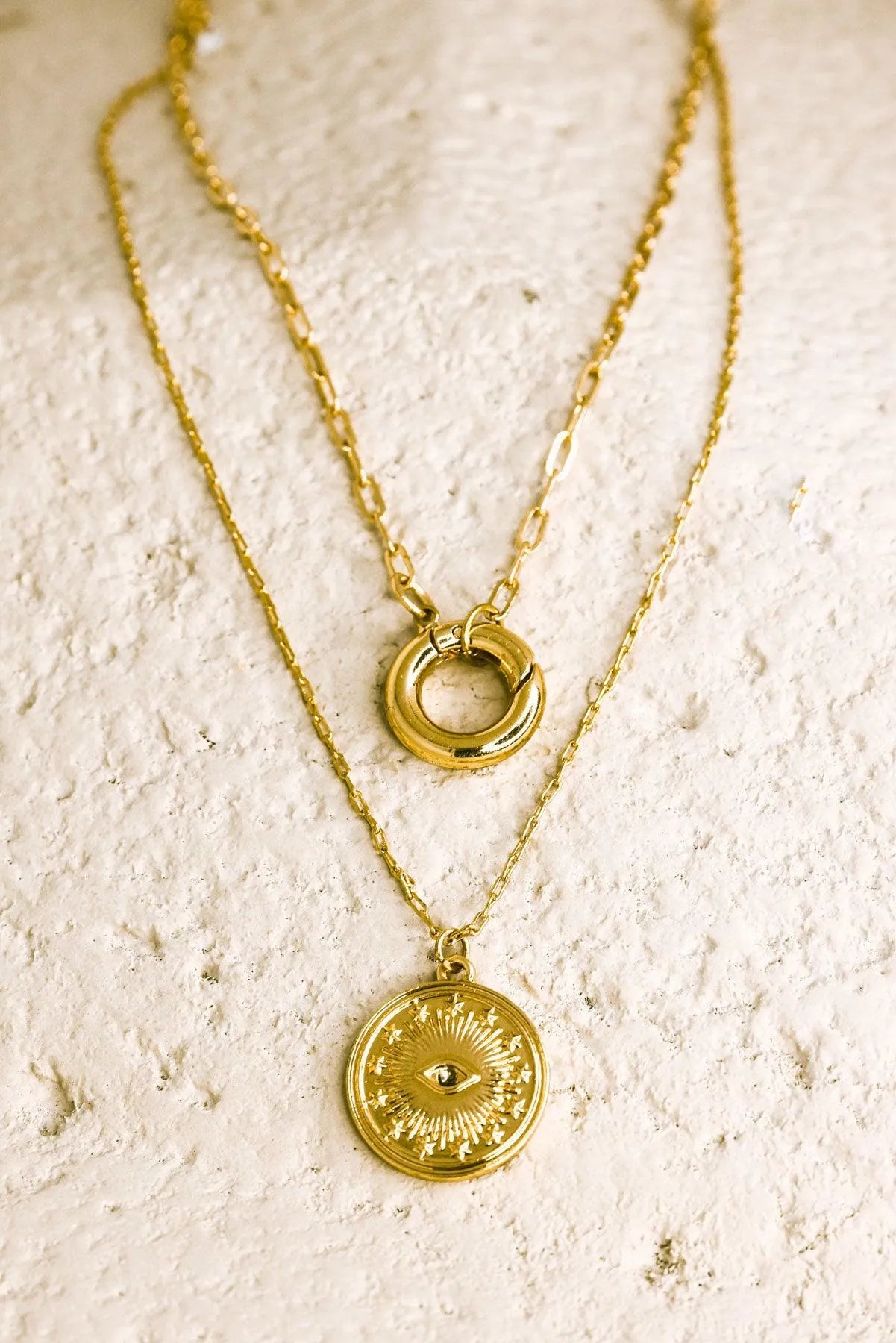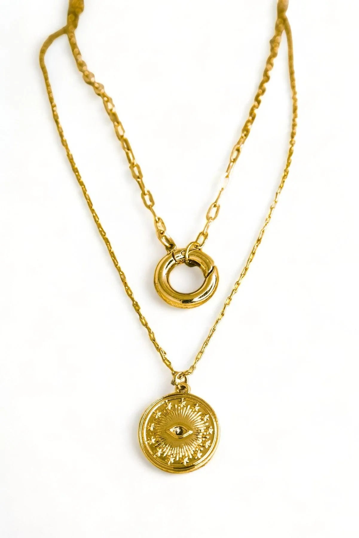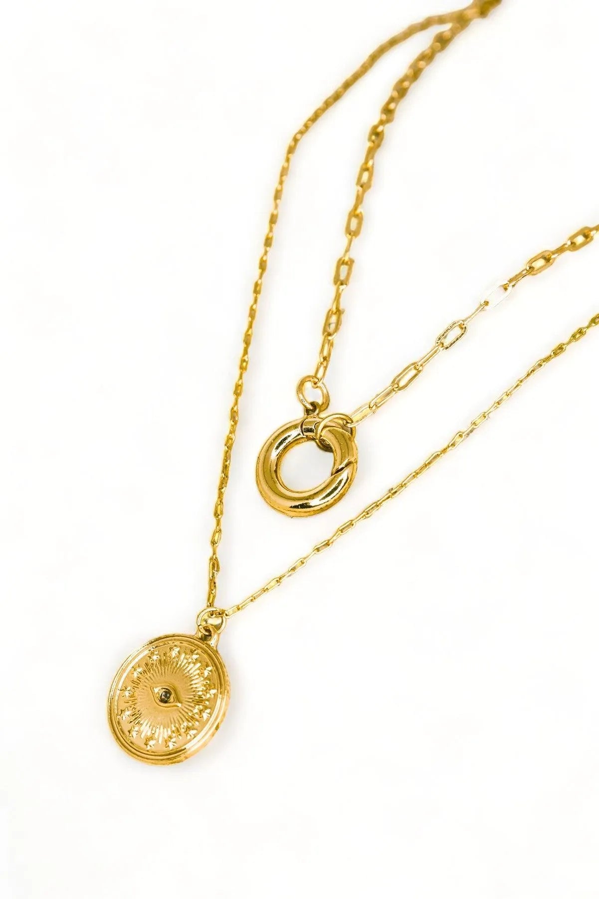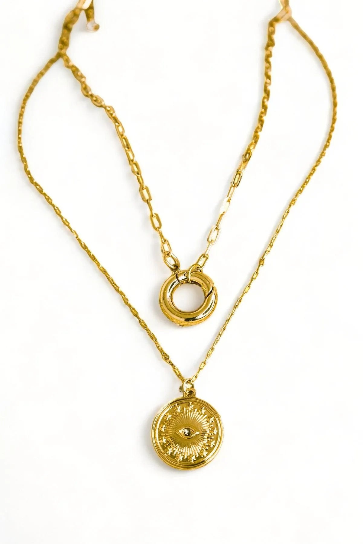 Gold Double Chin Evil Eye Coin Disc Pendant Necklace