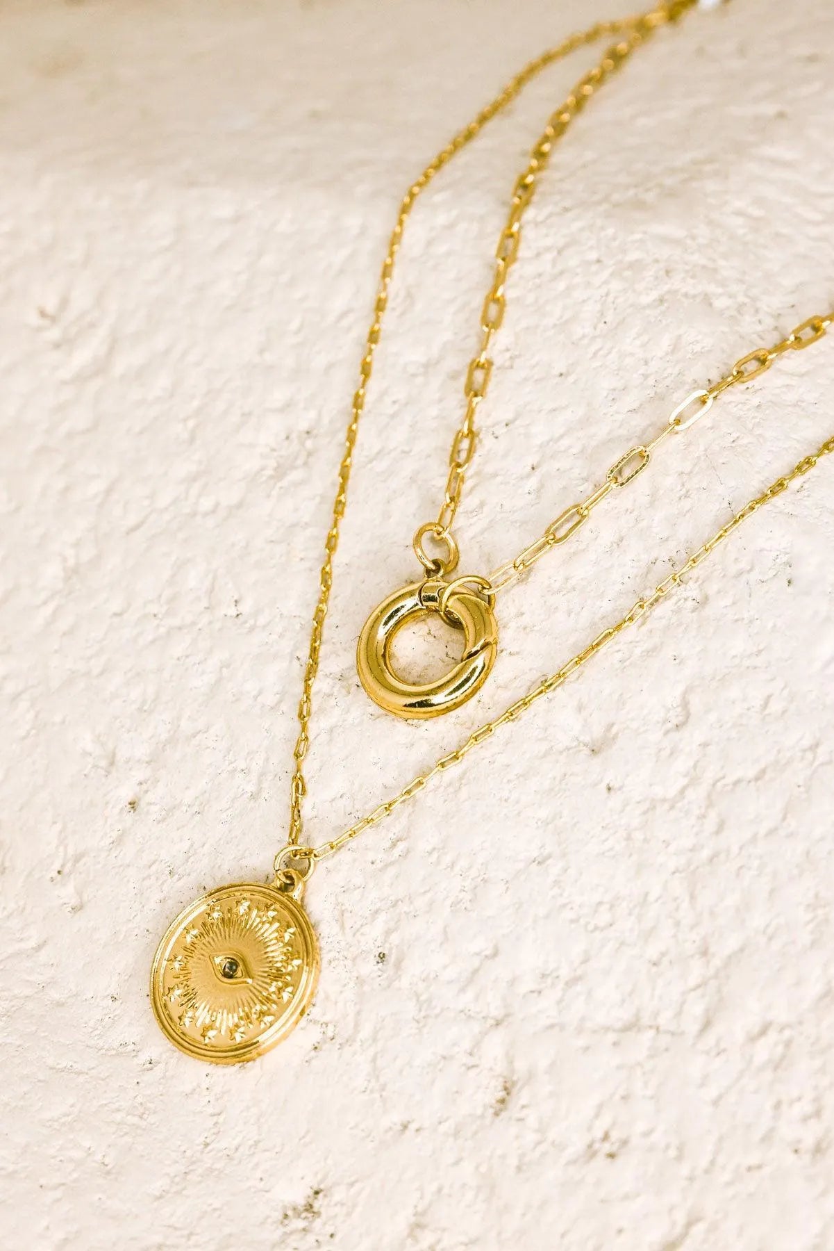 🖤 This layered double metal chain is anything but ordinary! With an eye-catching (pun intended) evil eye coin disc pendant, this unique piece not only adds some serious style to your outfit, but also offers protection against bad vibes.