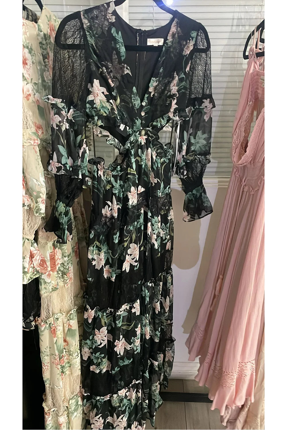 🖤 Features: Lightweight semi-sheer fabric, delicate lace panel details, feminine tiered ruffle design, statement bell sleeves, flirty front cutout with tie closure, V-neckline, floor-length silhouette, navy floral print, true-to-size fit