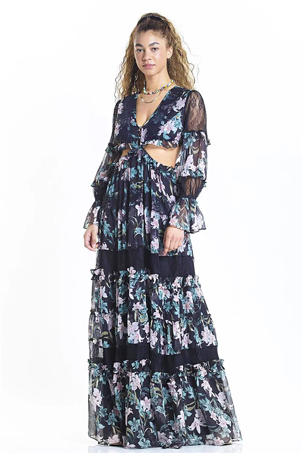 Floral Lace Panel Tiered Maxi Dress - Bohemian Cutout Ruffle Sleeve