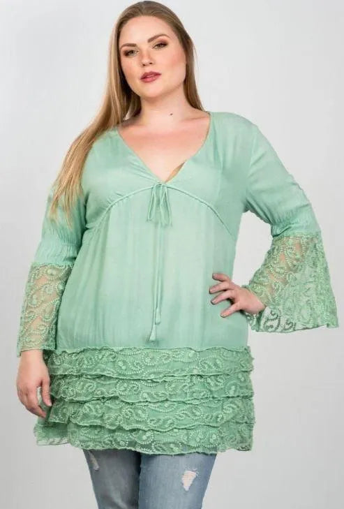 Boho Mint Plus Size Lace Hem V Neck Tunic Top