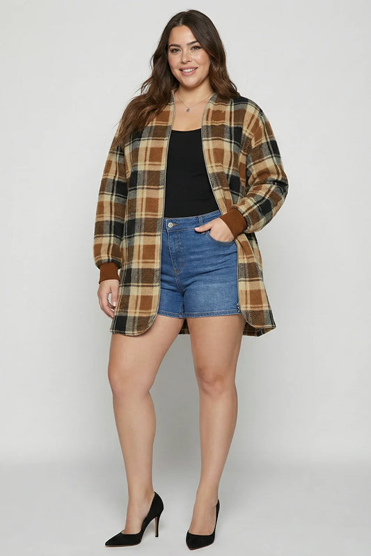 Plus Size Cozy Oversized Plaid Hooded Shacket Fleece Button-Up JacketVendor:New In