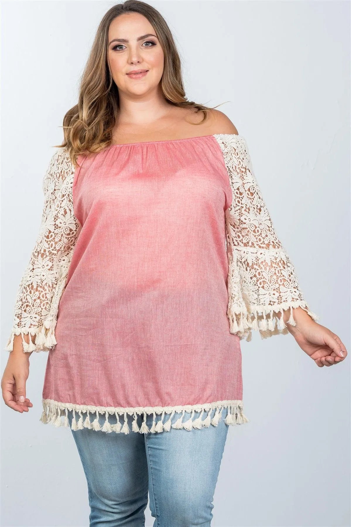 Boho Pink Plus Size Off The Shoulder Tassel Top /2-2-2