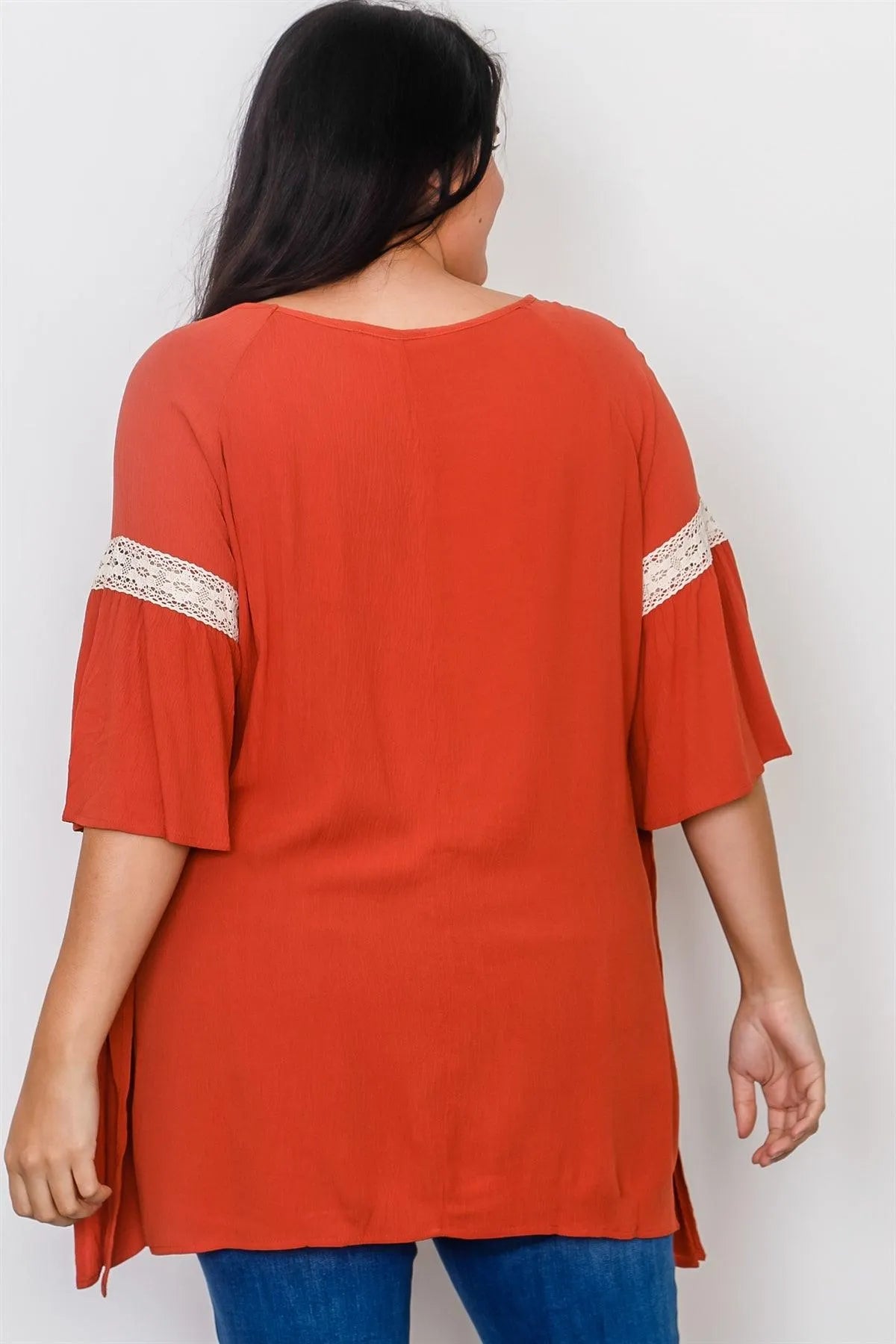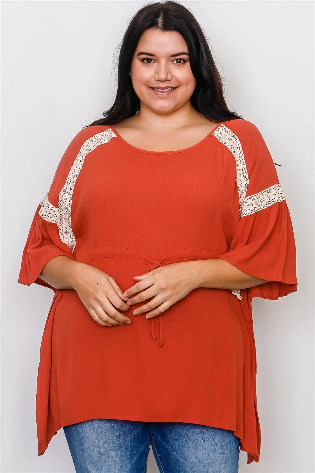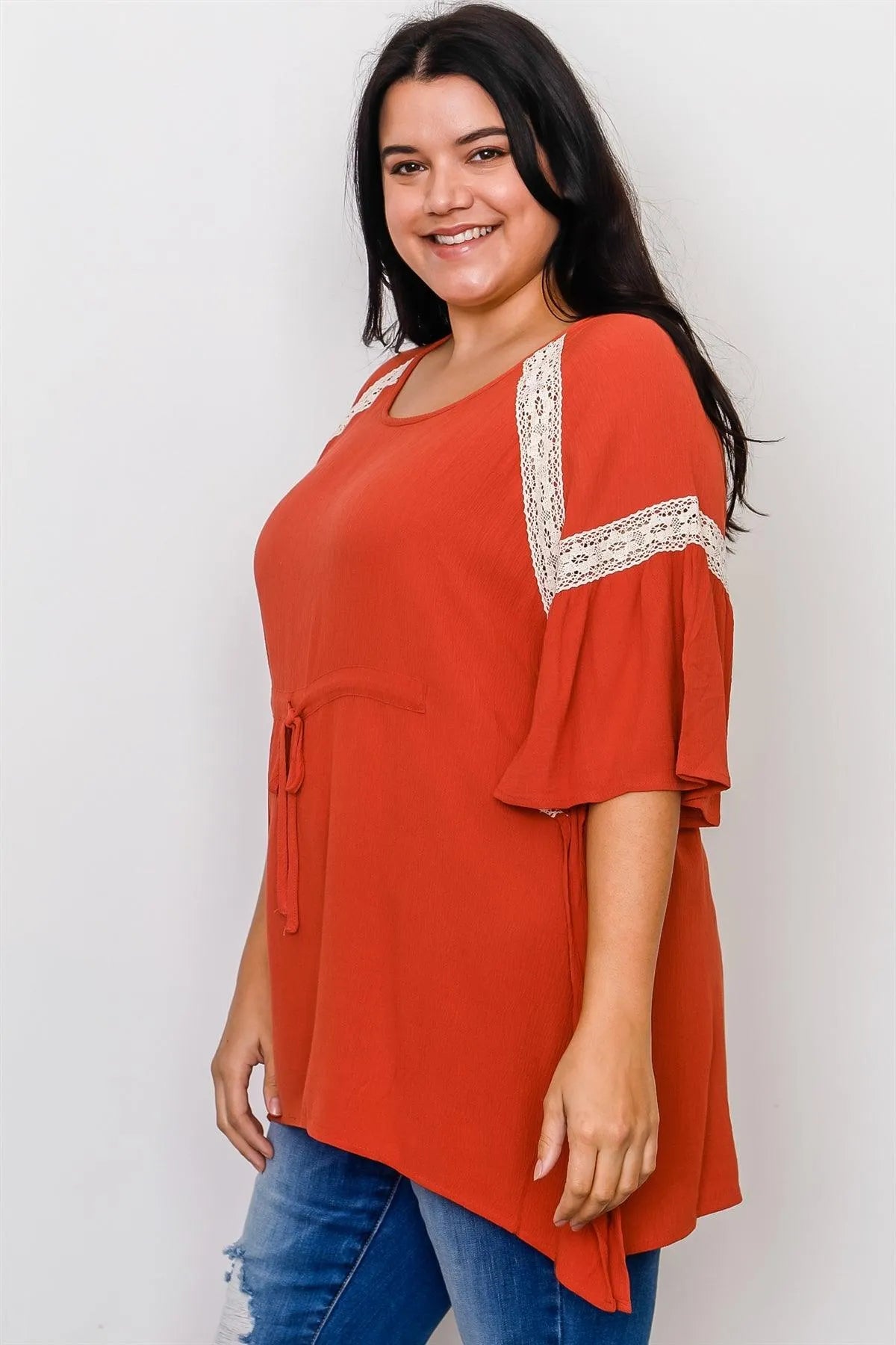 Boho Plus Size Rust Drawstring Waist Crochet Trim Top /2-2-2