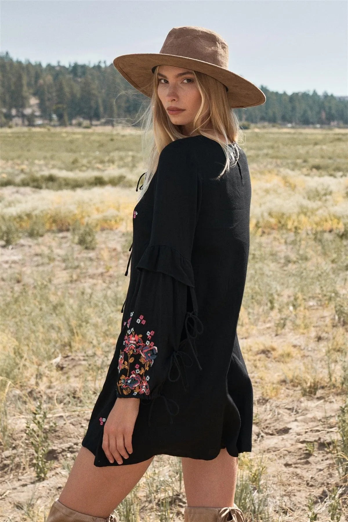 Boho Black Floral Embroidery Relaxed Fit Round Neck Long Frill Slit Self-Tie Balloon Sleeve Detail Mini Dress /2-1-3