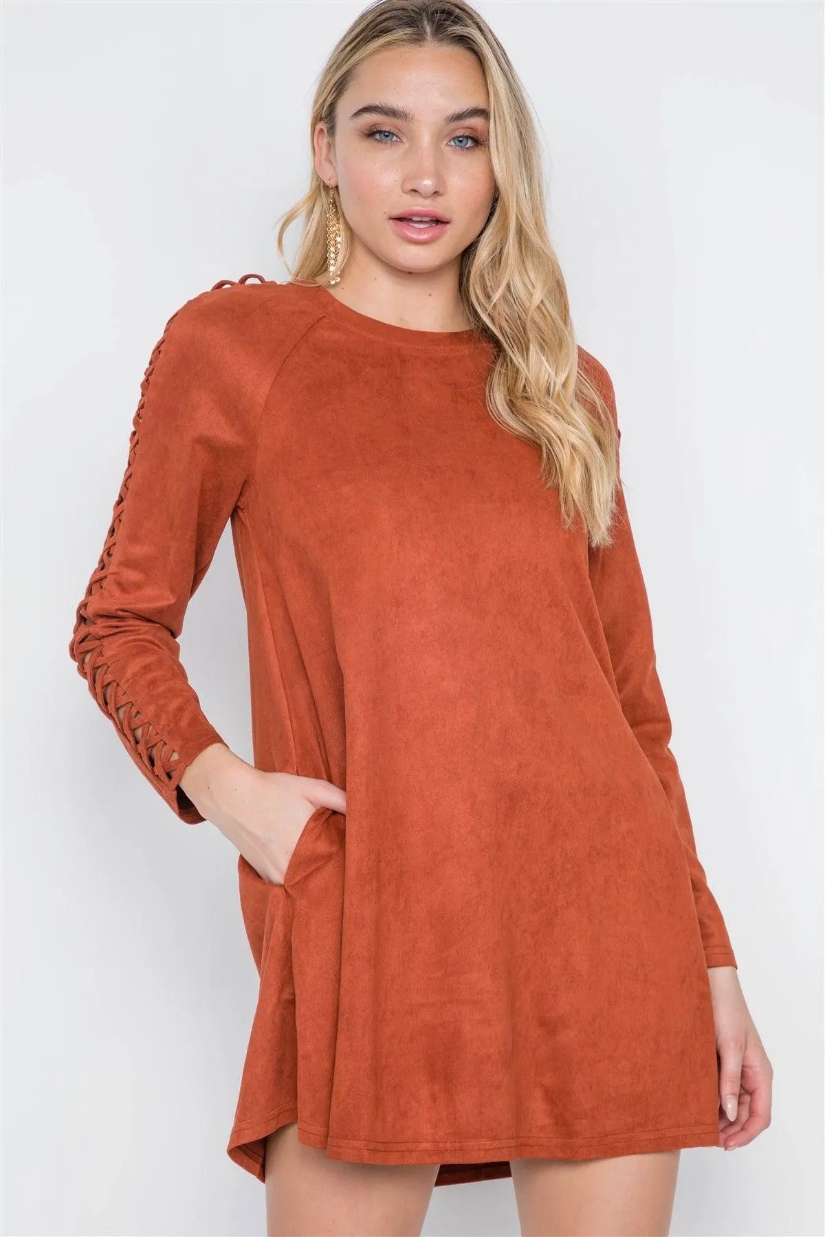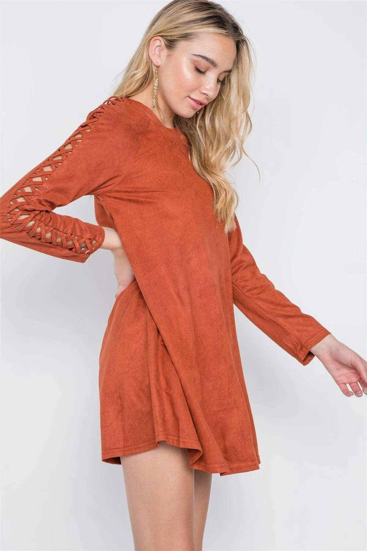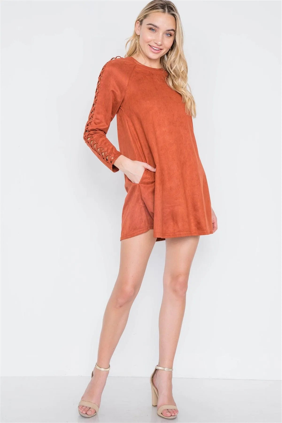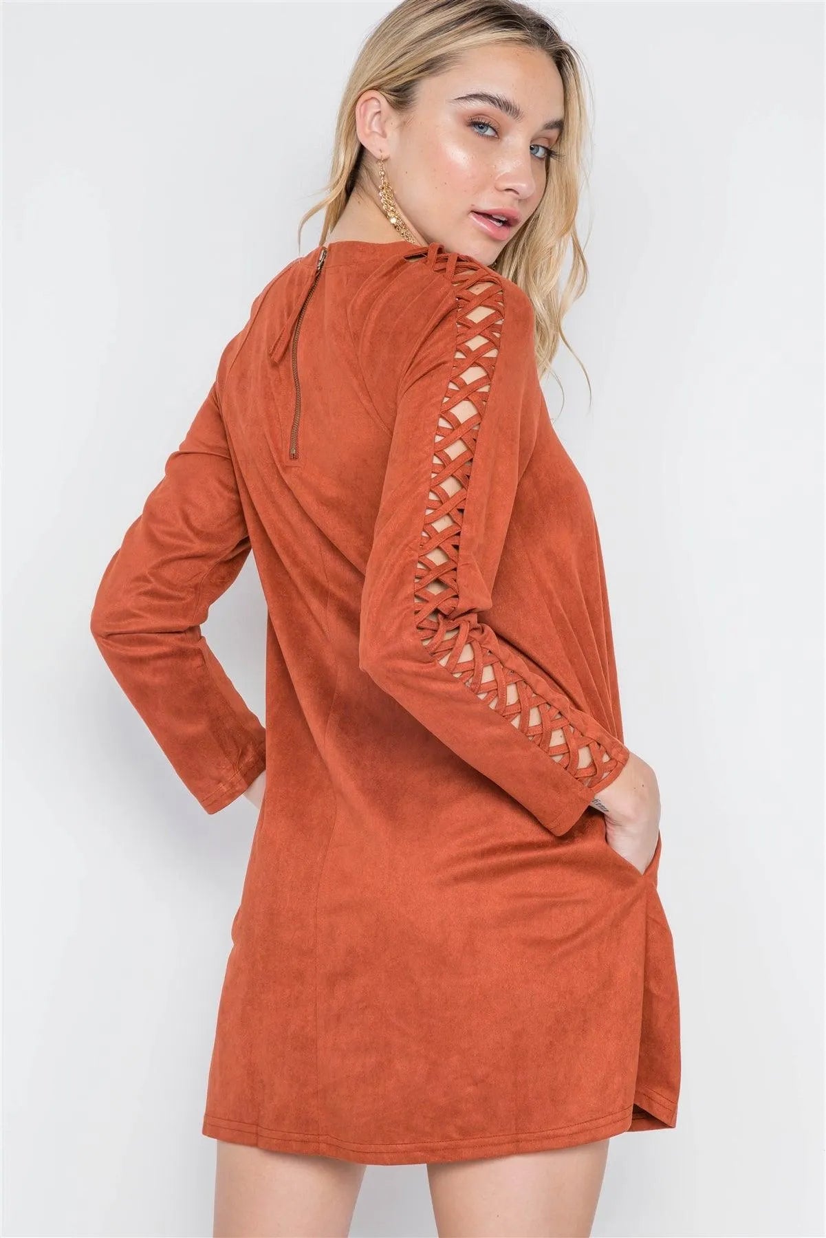 Brick Faux Suede Strap Sleeves Mini Shirt Dress /2-2-2